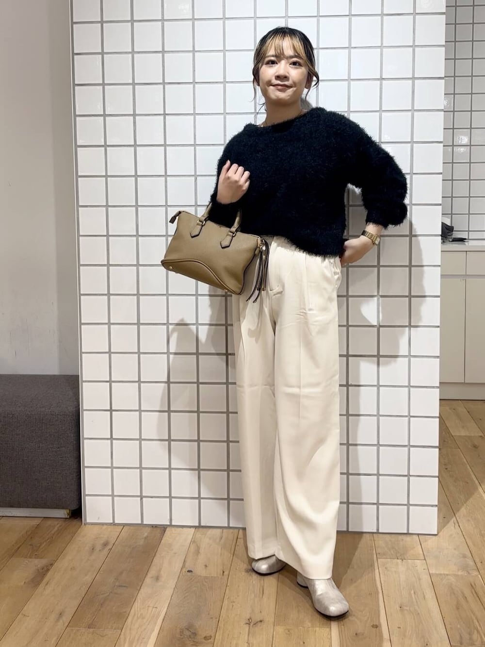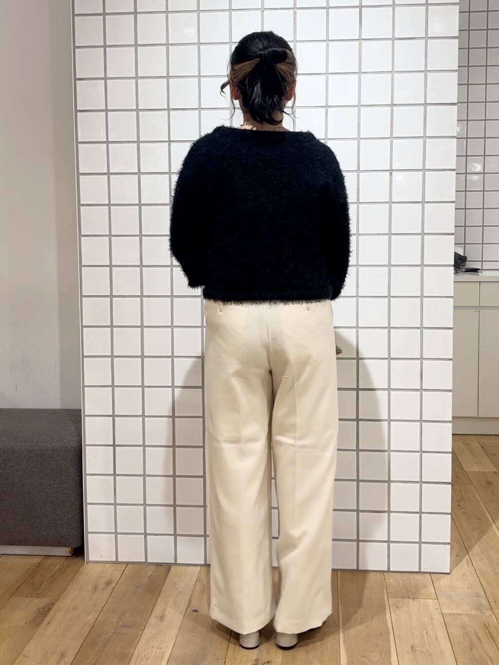 フェザーのニットは毛足が細かいので、着膨れが気になる方でも気にせず、スッキリ着れます◎