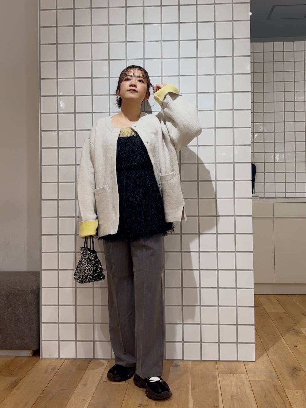 冬で暗くなりがちになりますが、袖とインナーの部分を同じ色にして統一感を出しました💛
