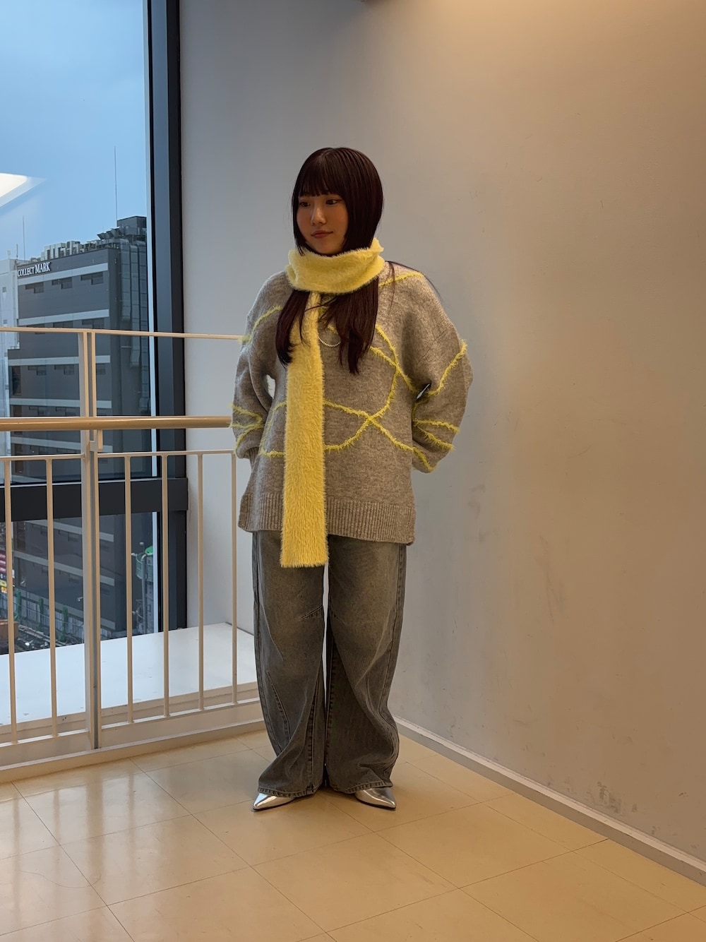 マフラーもニットの柄も派手な黄色ではないのでカラーコーデしやすいお色になってます😌
