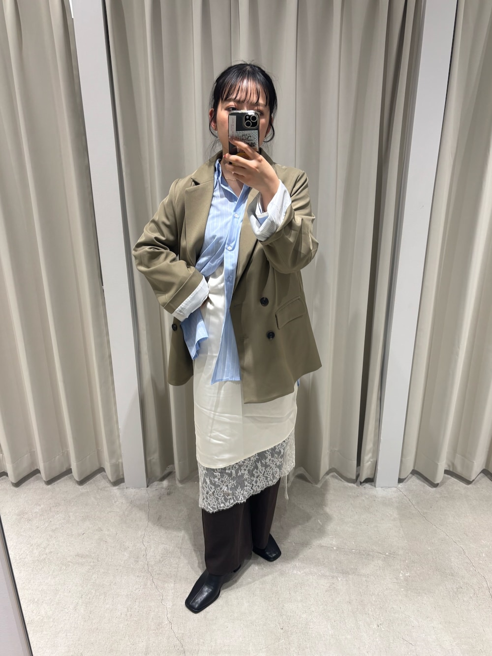 ジャケットとシャツでキレイめ感を出しながらガーリーなレースキャミワンピースと合わせ、パンツとレイヤーをしてトレンド感のあるコーディネートにしてみました👗中の青シャツを持ってくることで全体的に暗くならず、バランスの良いコーディネートになります✨️