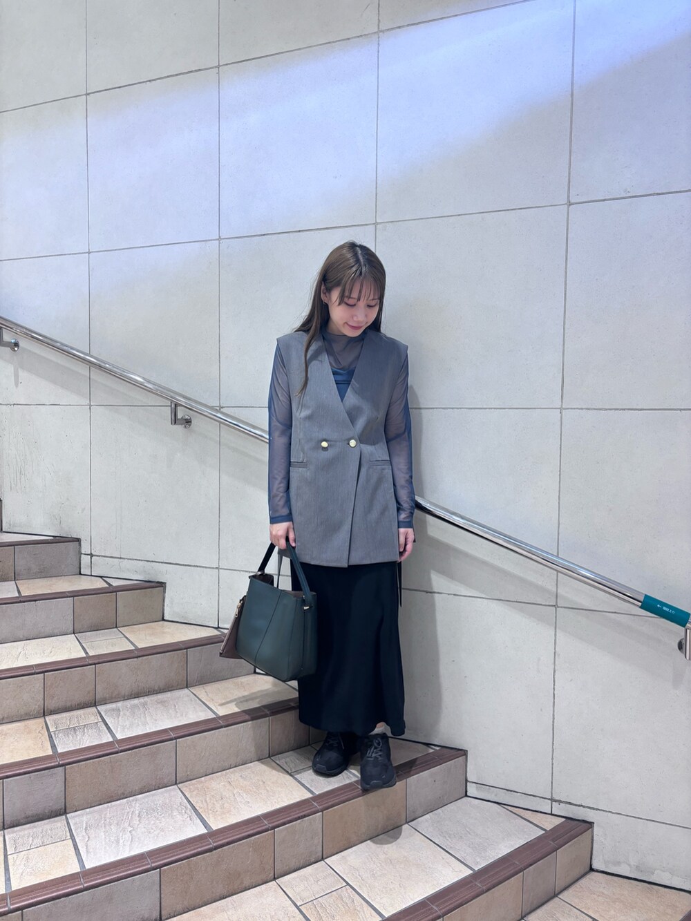 縦長のシルエットのジレとストレートスカートですっきりとした印象に〇