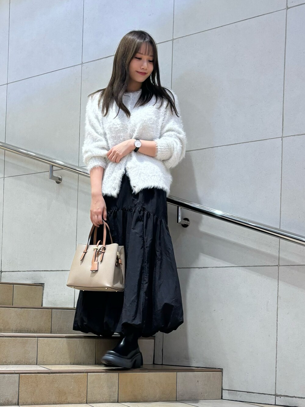 ラメ感あるカーディガンとバルーンスカートで大人可愛く◯