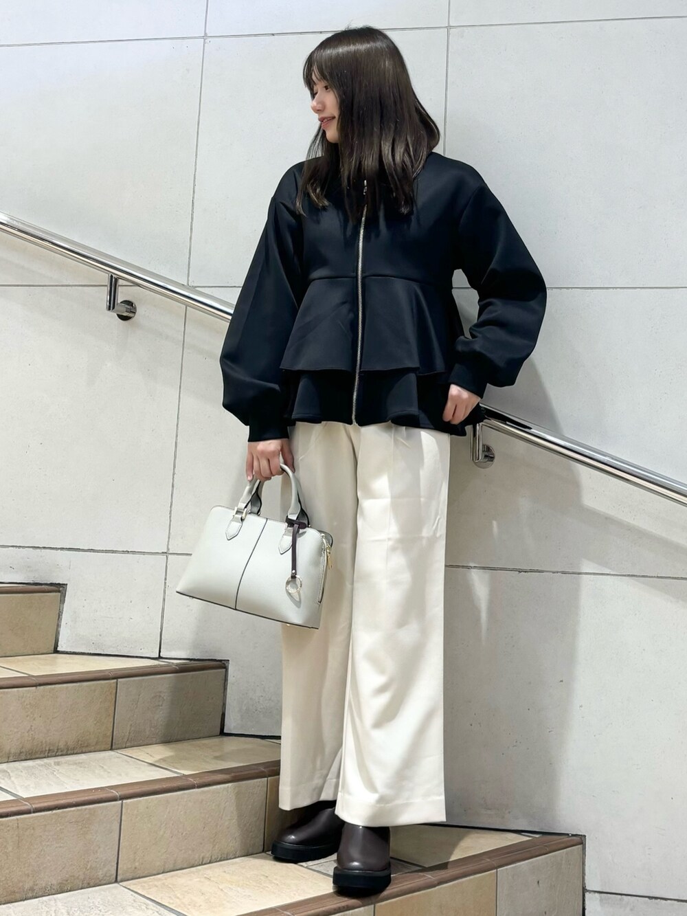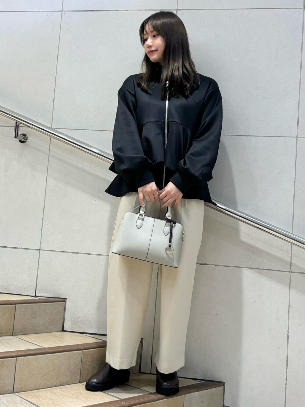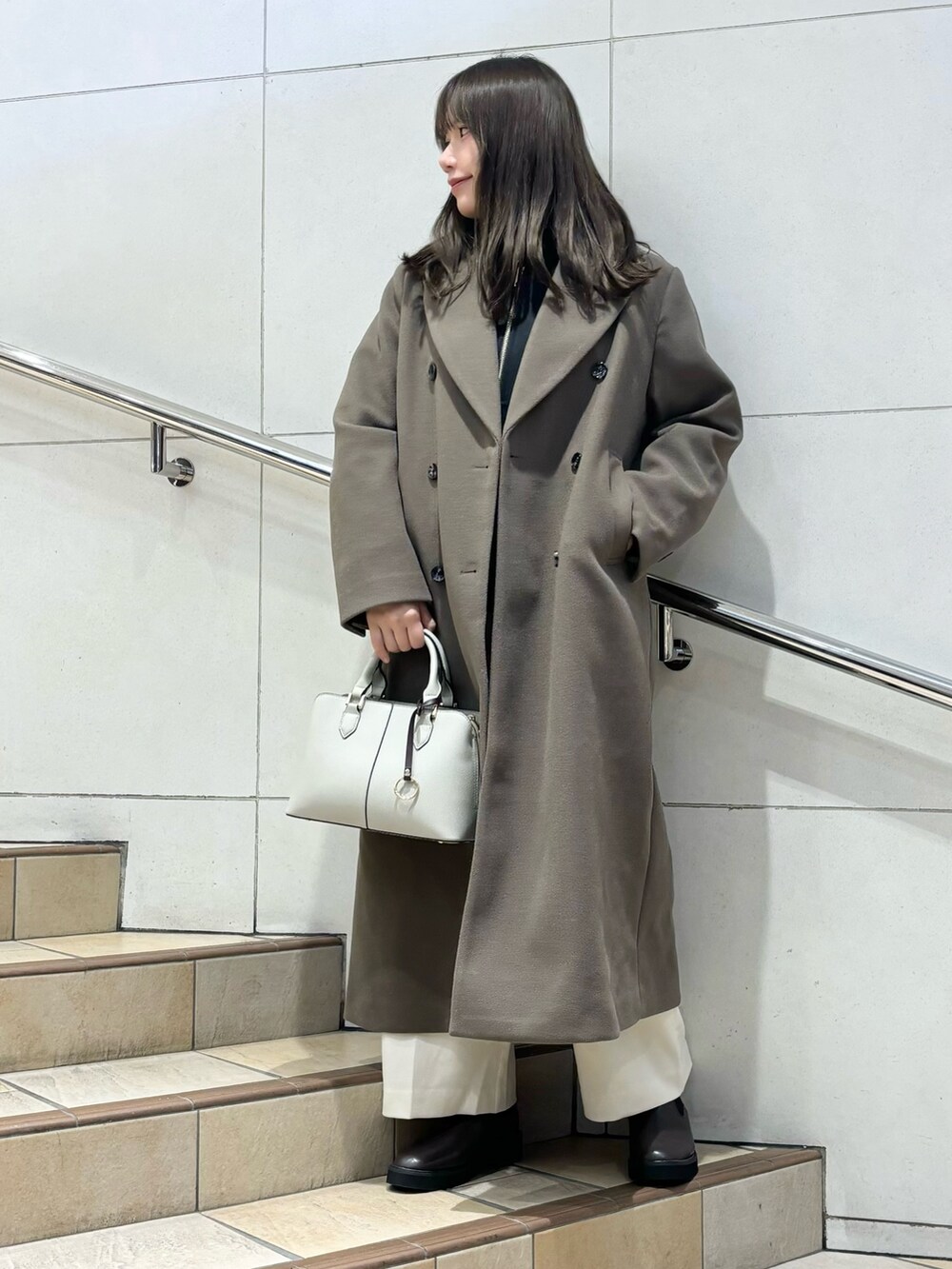 ハイネックのニットとカーディガンであったか防寒コーデ