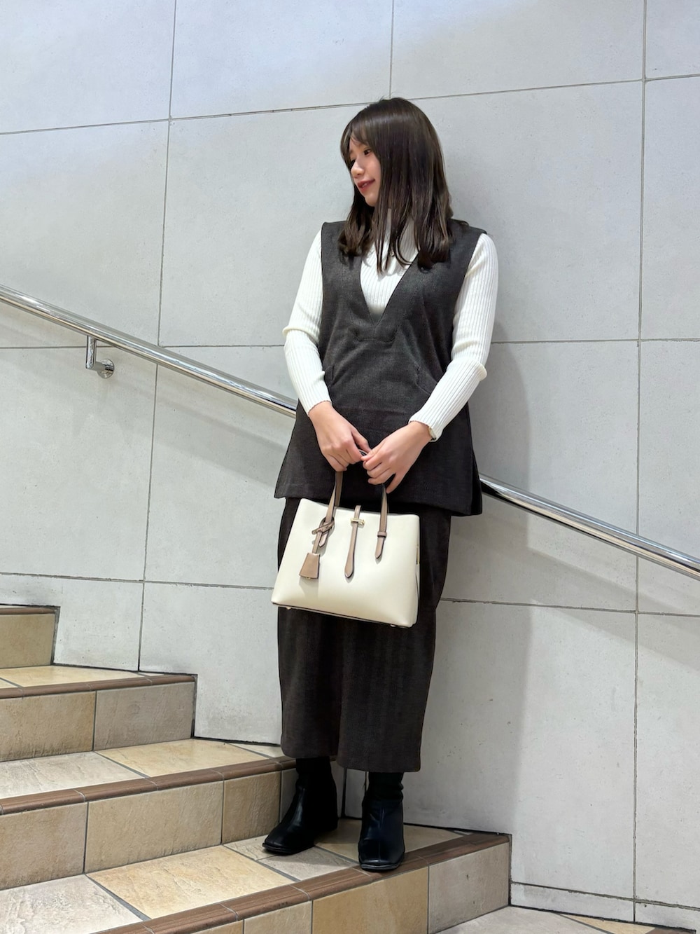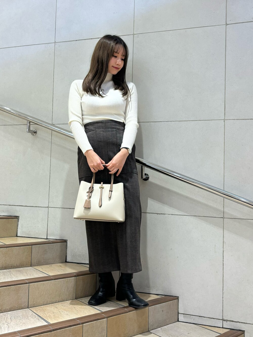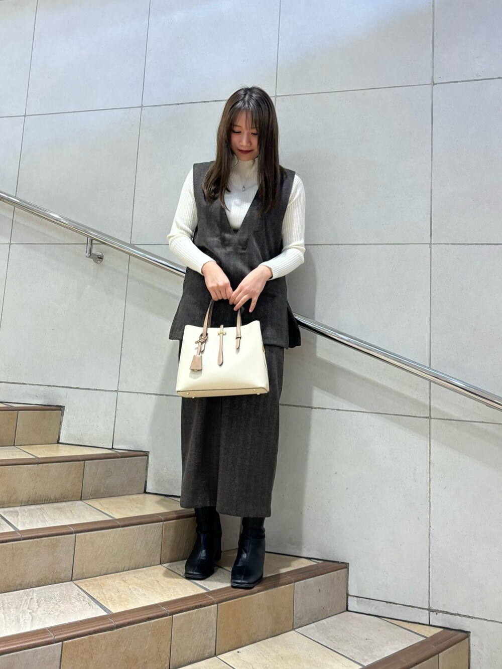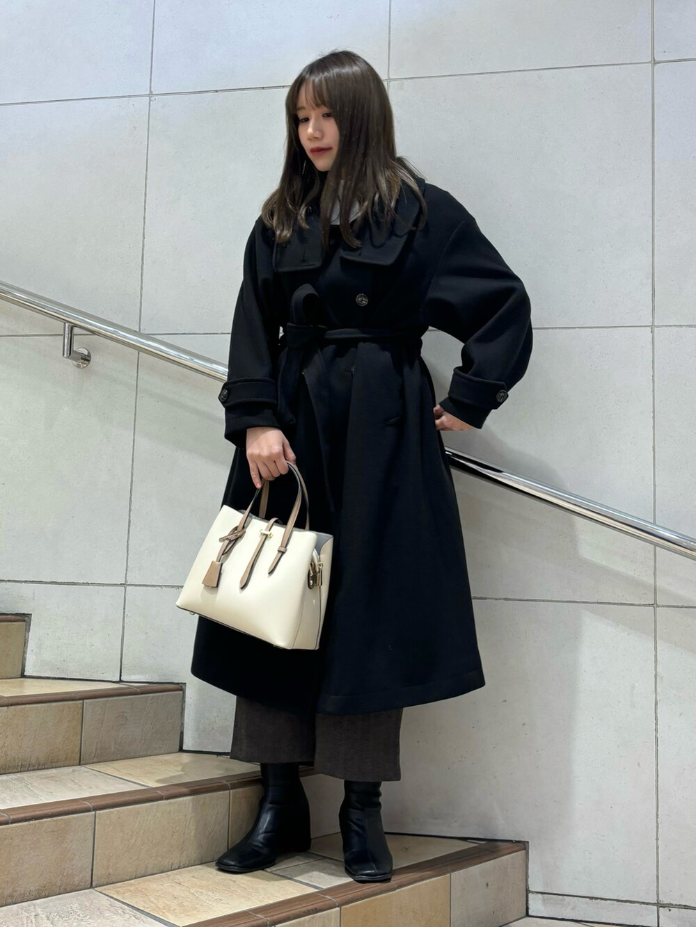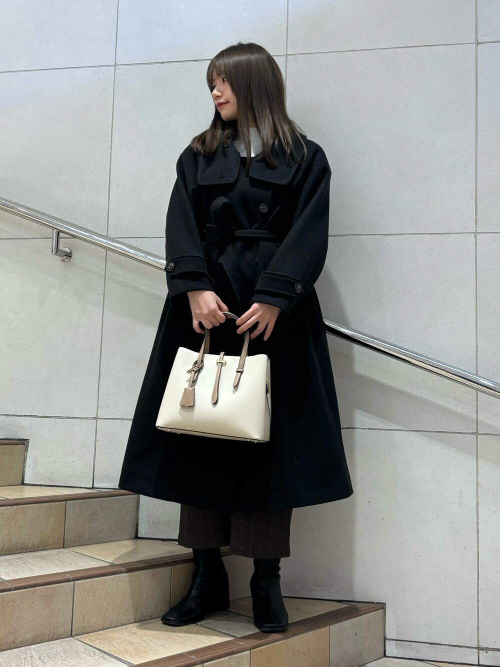 ブラックのロングコートとアイボリーのバッグでモノトーンコーデ