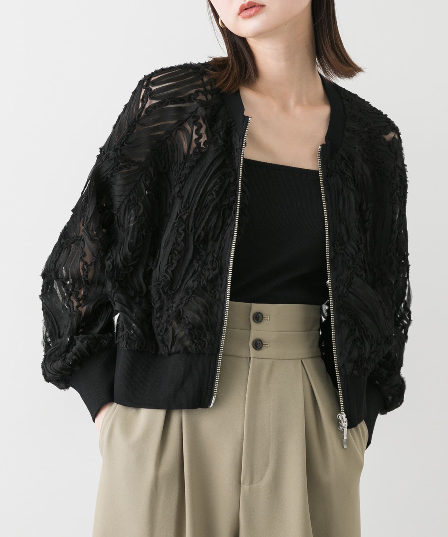 コードシシュウのジャケットでシアーを取り入れ抜け感アップ