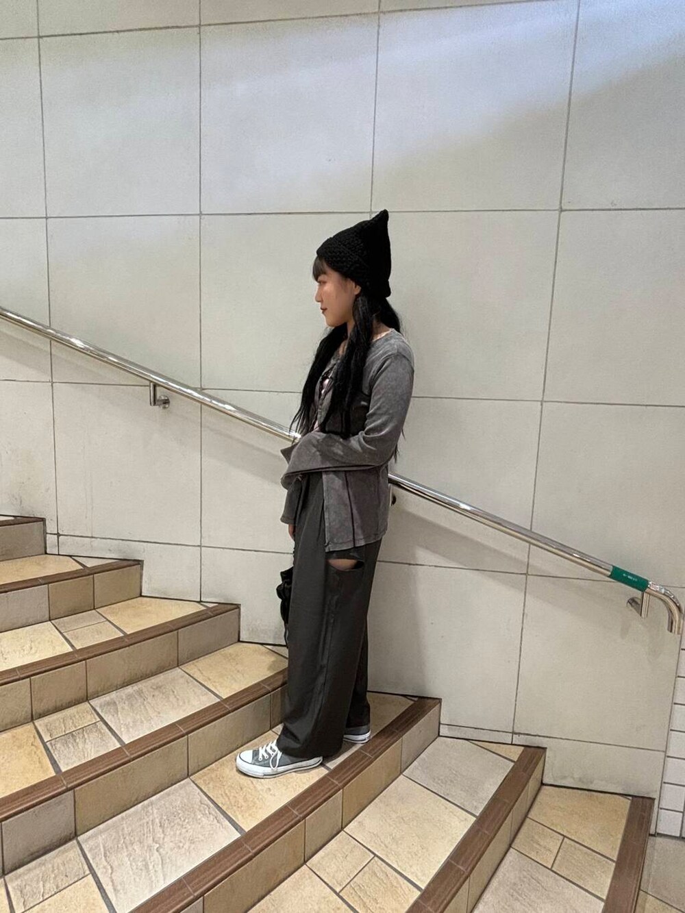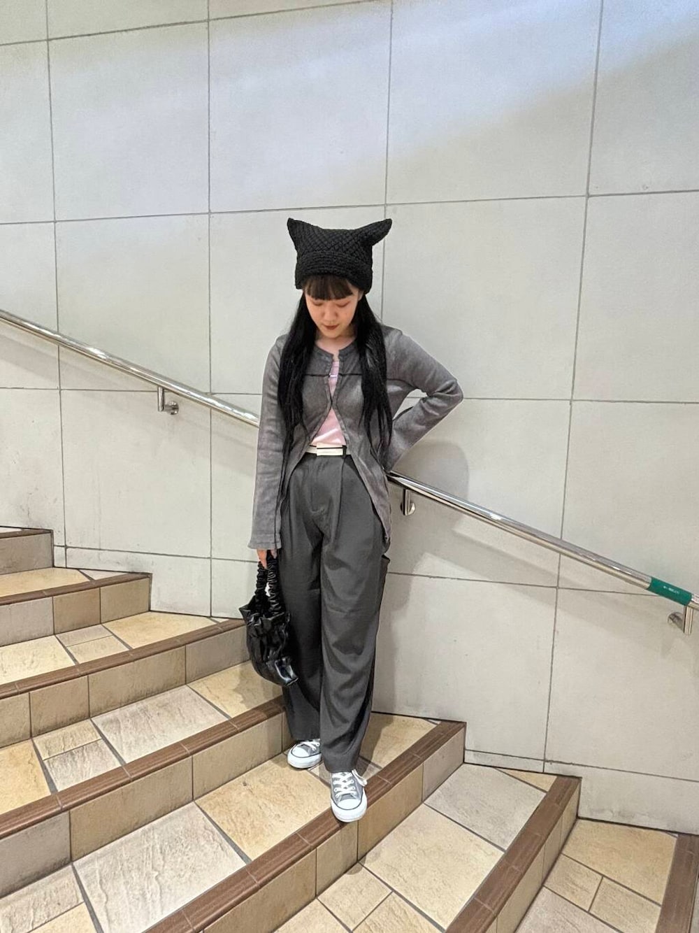 グレーでトーンを合わせつつ小物にアクセントで猫ミミ。