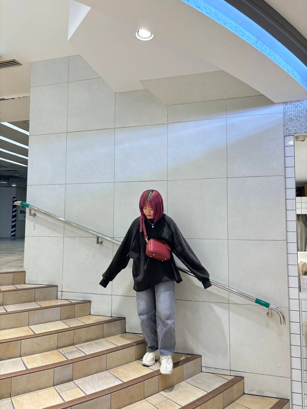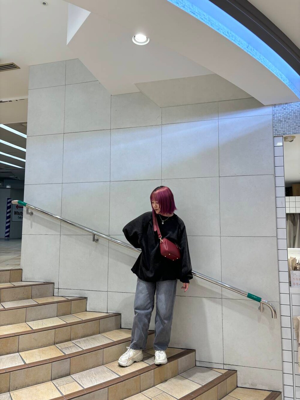 ヴィンテージ感のあるゆるゆるスウェットにデニムもゆるゆるでアクセントに赤を◎