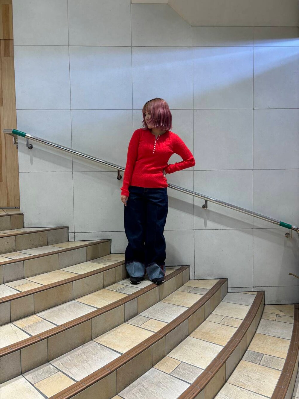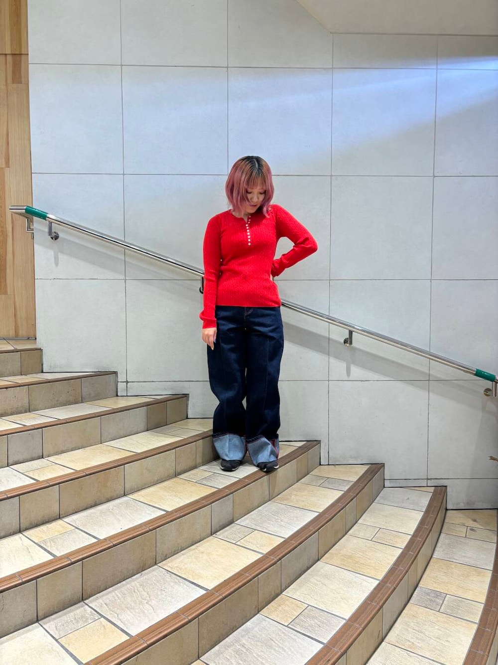 トップスの赤とデニムに入ってるラインを合わせてます◎