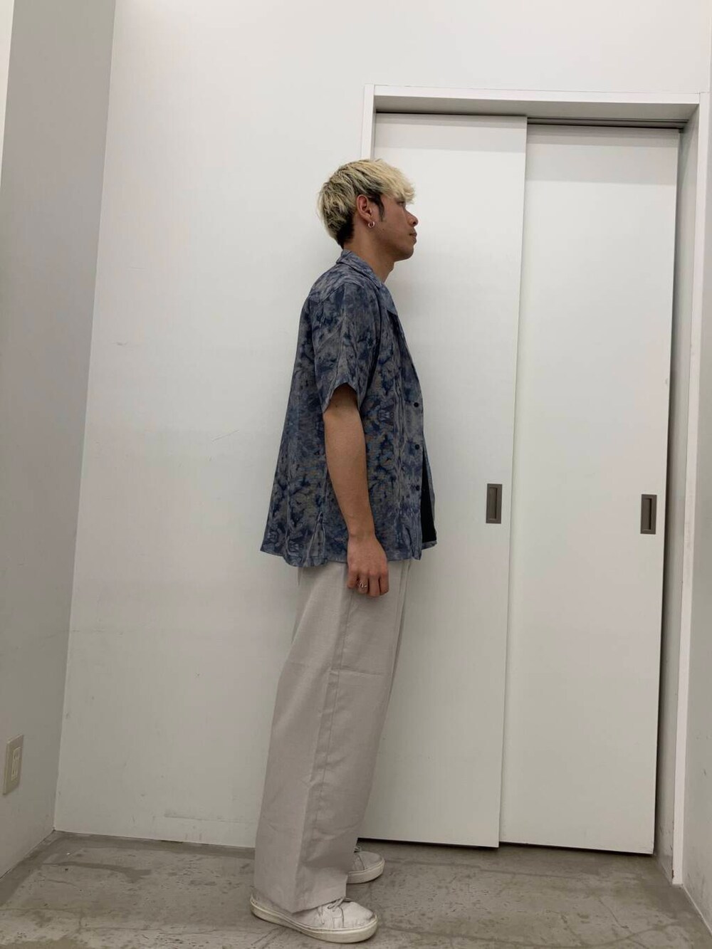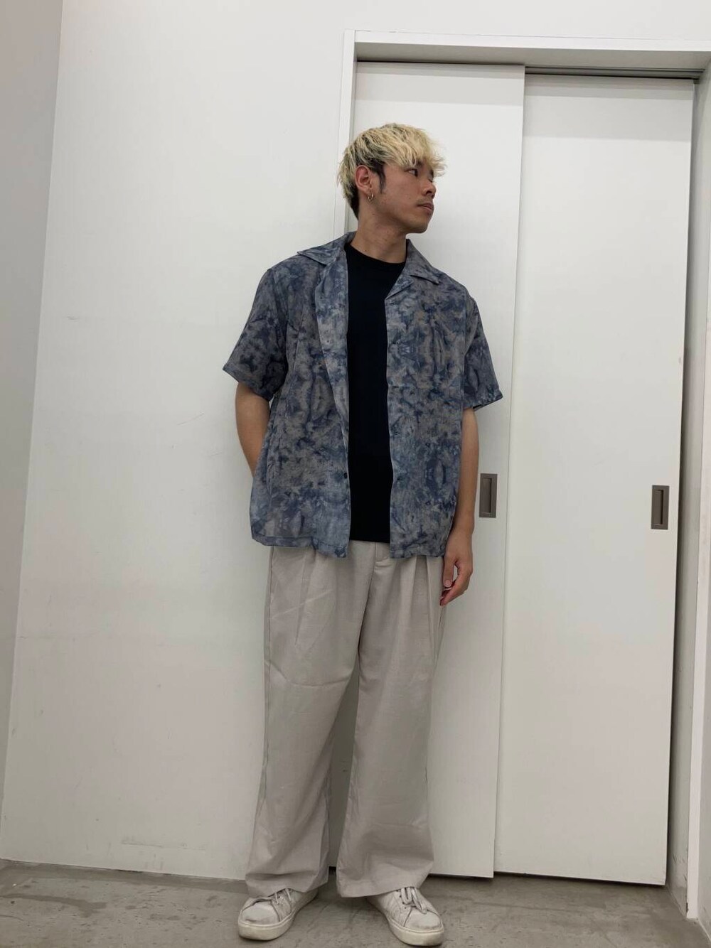 アロハシャツのような柄が入っているので、夏らしいリネン生地のパンツやハーフパンツと合わせるのがおすすめ!