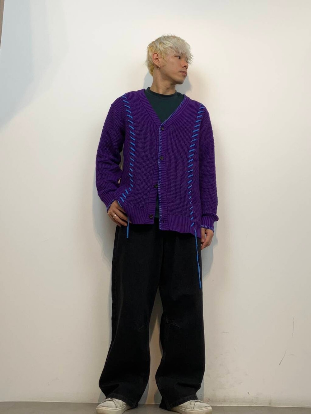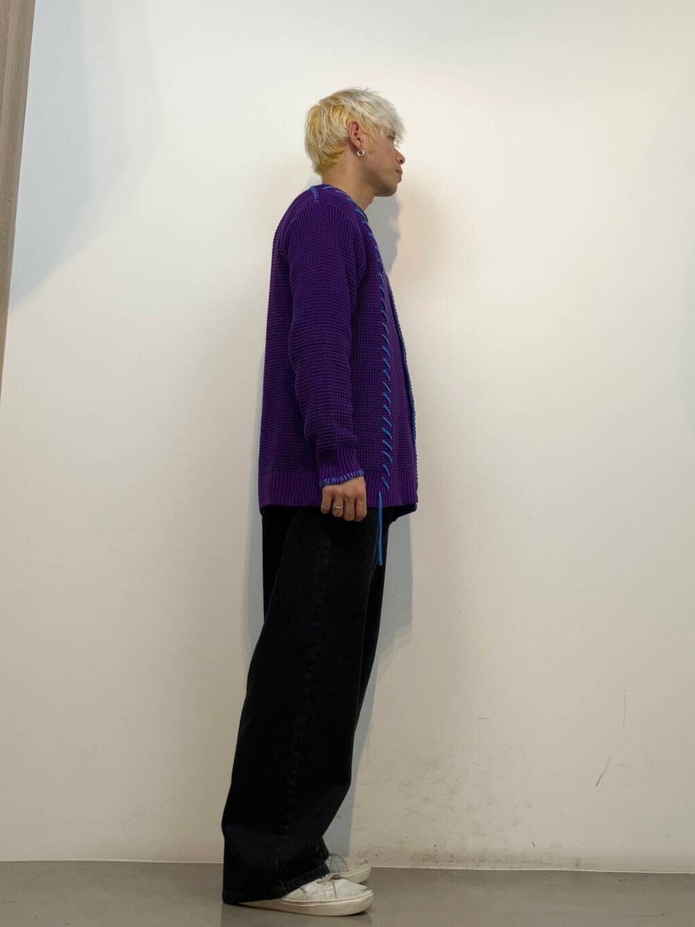 鮮やかなパープルが印象的なカーディガンは、メンズアイテムにはあまり無い色合いで周りと差別化できます!