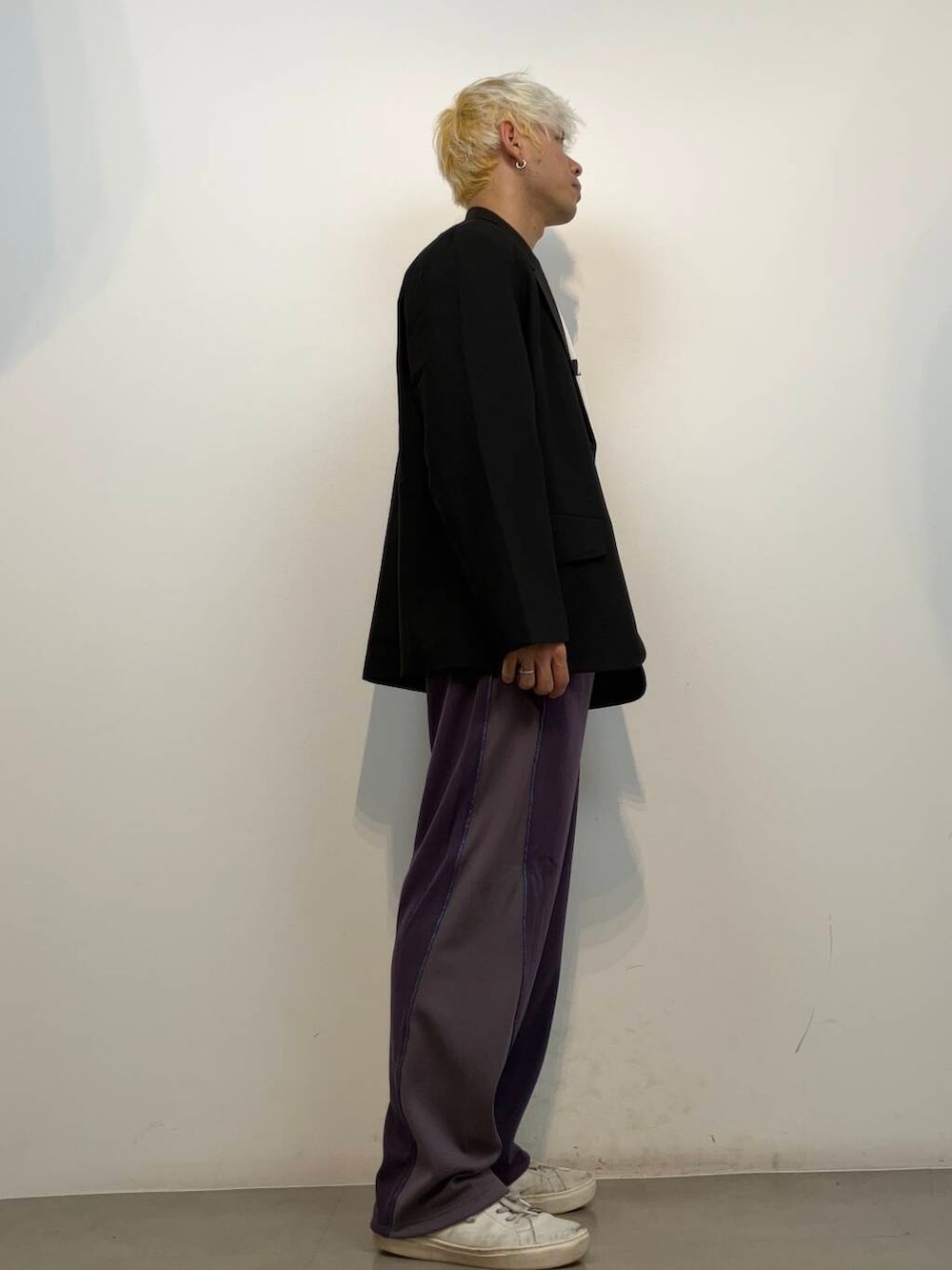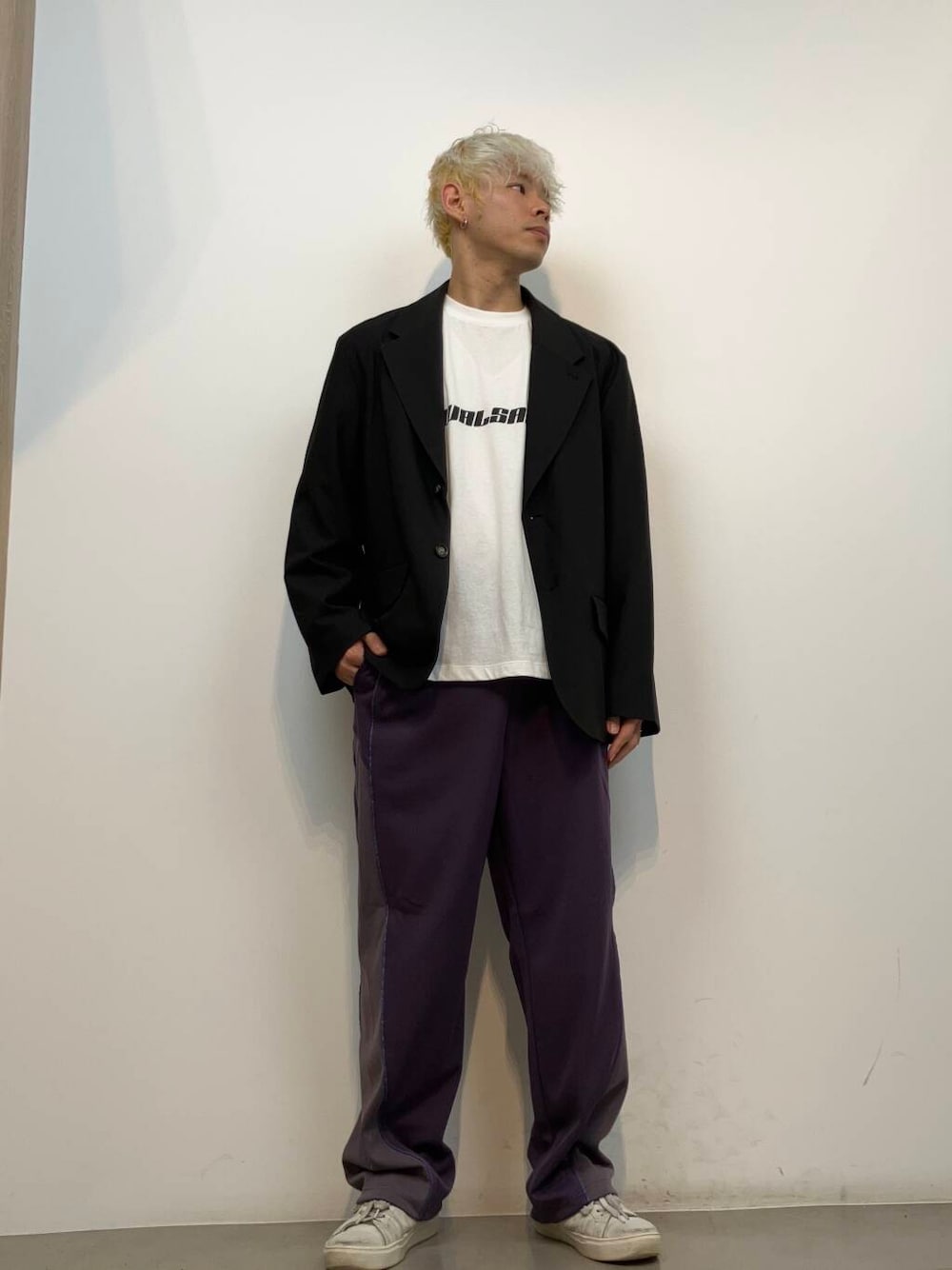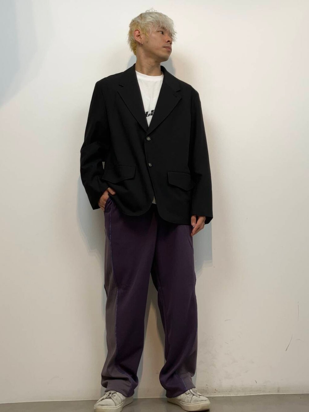 シングルでカジュアル使いもしやすいジャケットは、大きめサイズでワイドパンツやトラックパンツとも相性抜群!