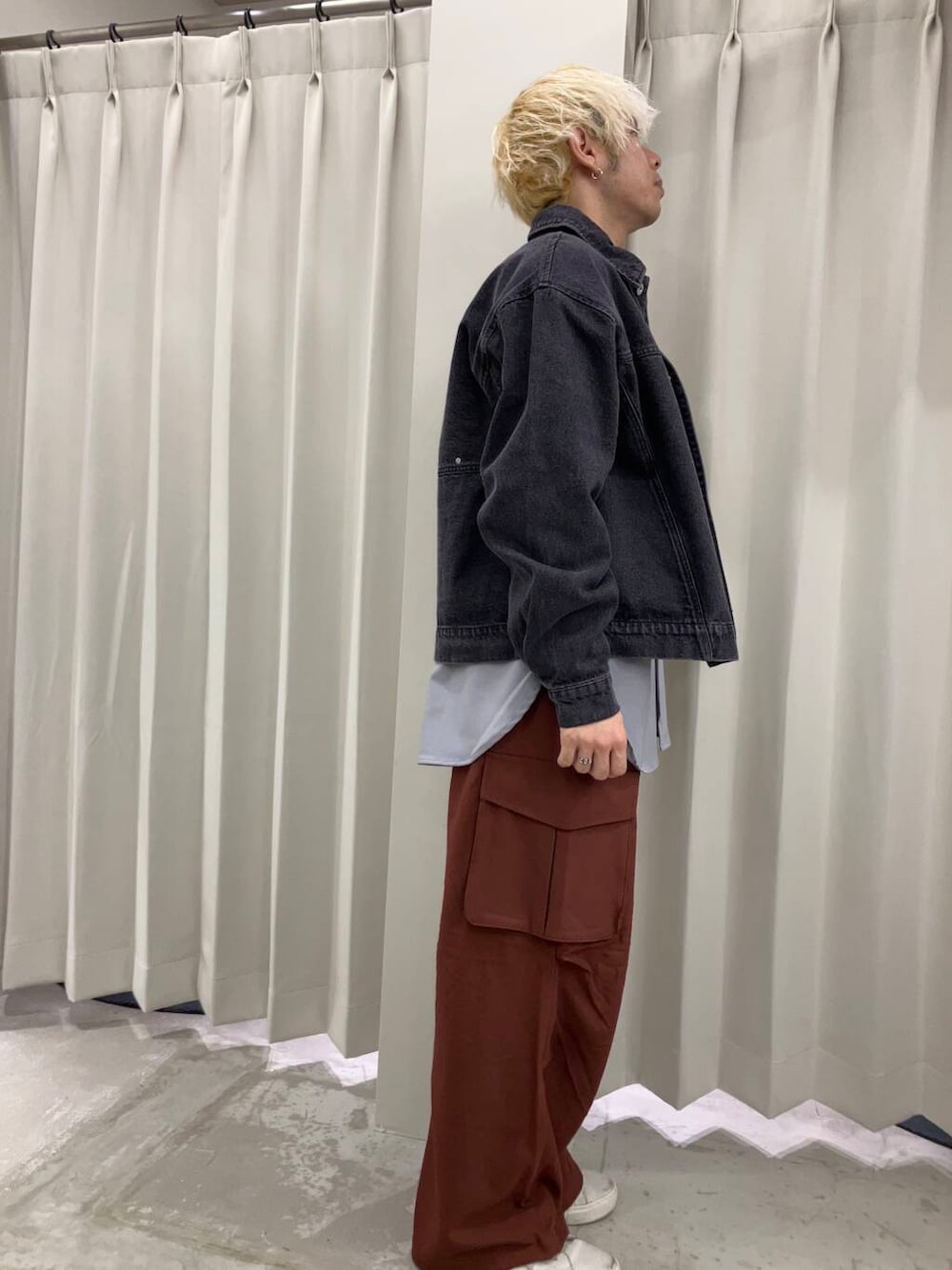 デニムジャケットは今回はパープルをチョイス!黒に近いパープルなのでどんな色にも合わせやすく、セットアップで着るのもオススメのアイテムです!