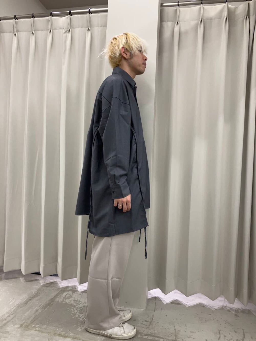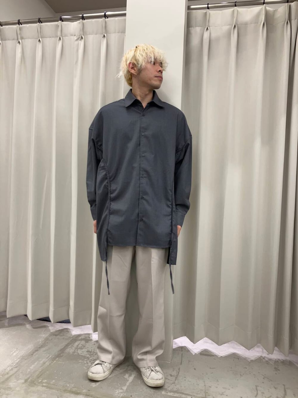 かなりロング丈のシャツになっていて、身幅も大きいのでオーバーサイズで着ること前提のシャツになっています!裾がドロストになっているのでシルエットの調整ができ、好きな形で着ることができます!