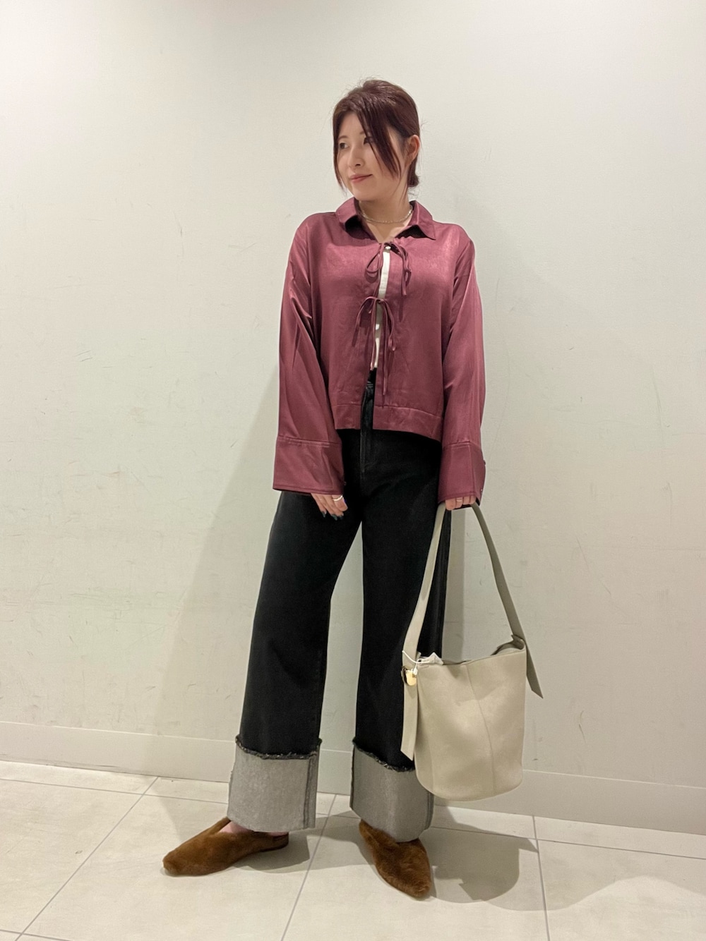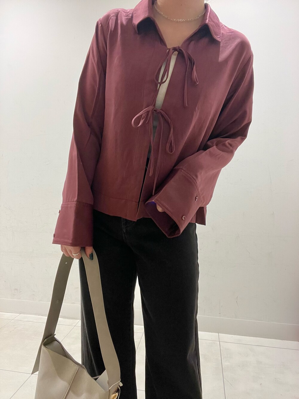 サテンシャツはフロントがリボンになってるので羽織としても使いやすいです◎