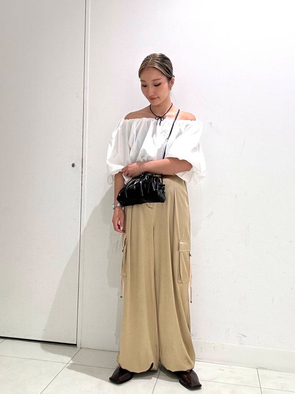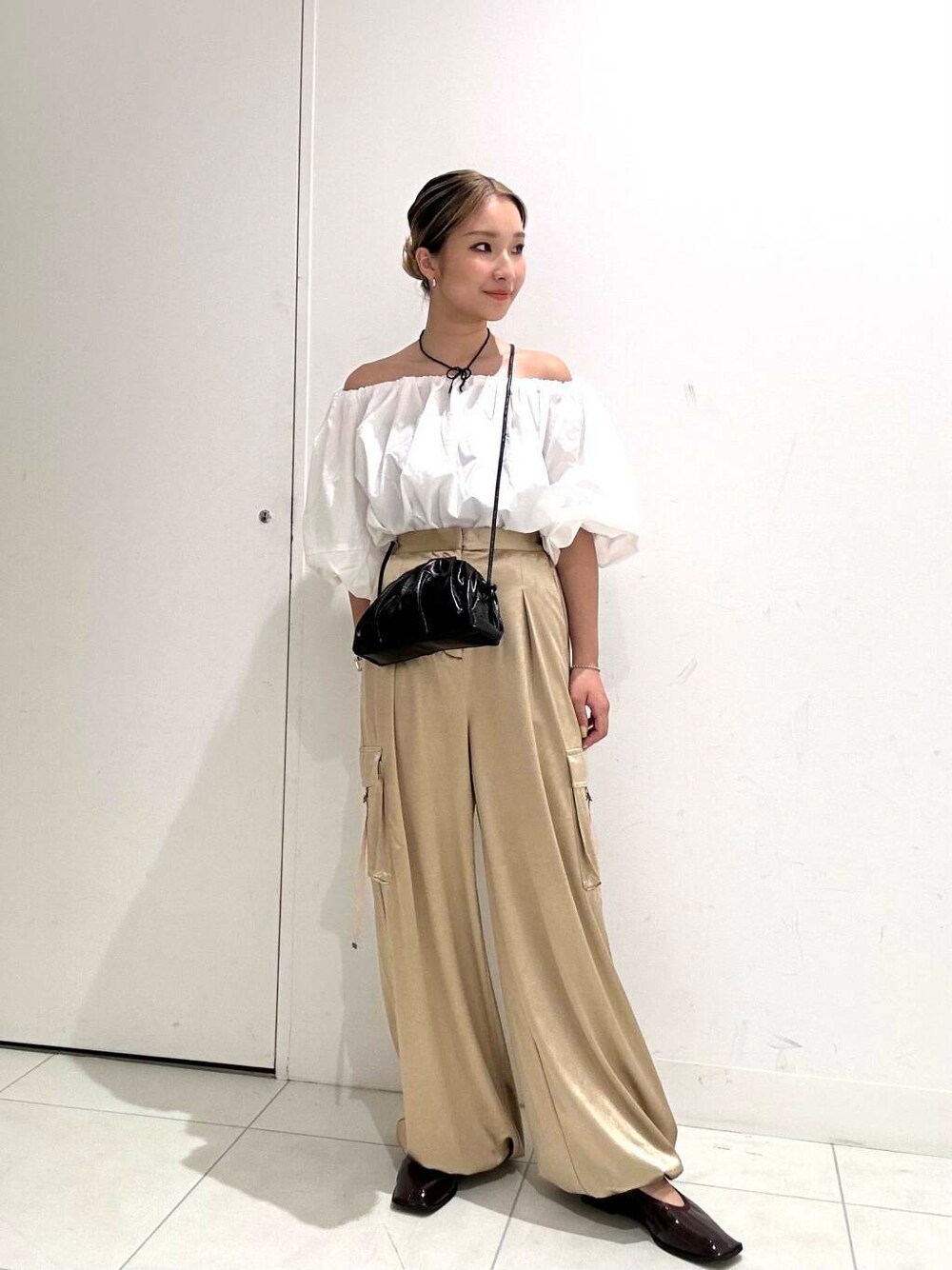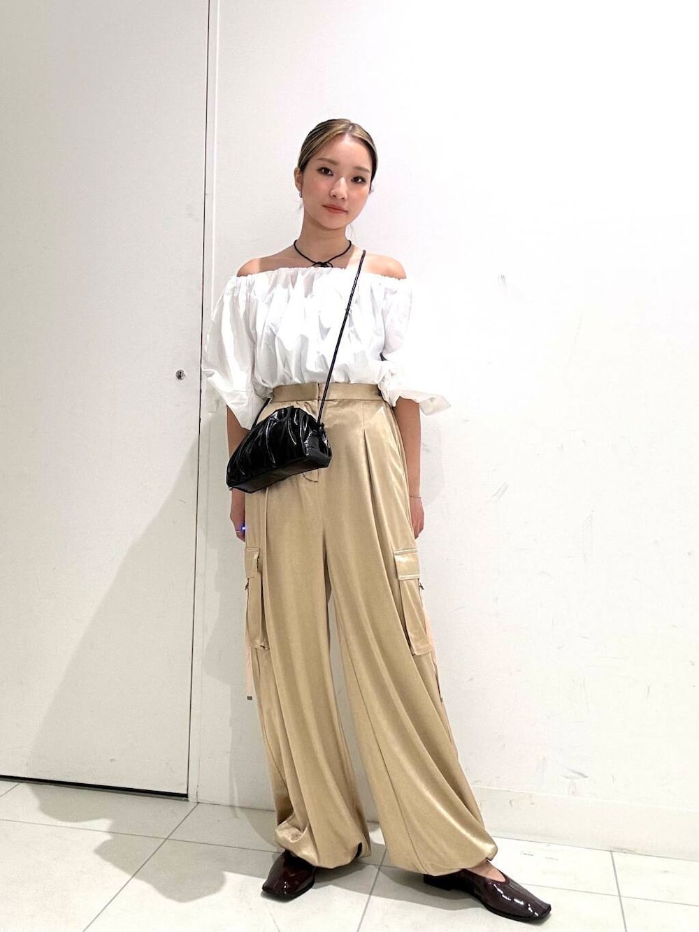 カーゴパンツはツヤっとした質感と落ち感が足を長く見せてくれます。