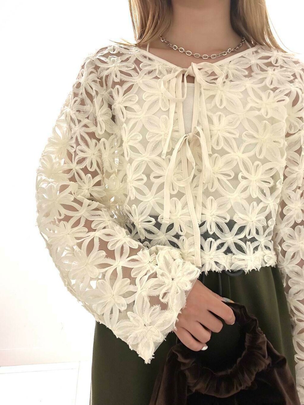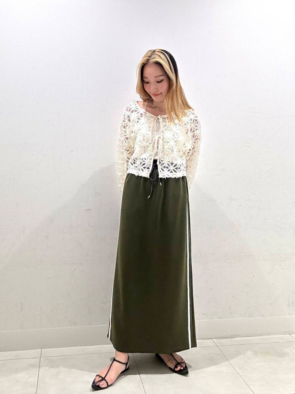 スカートにラインが入ってカジュアルなので透け感と大きめの花柄で女性らしく。