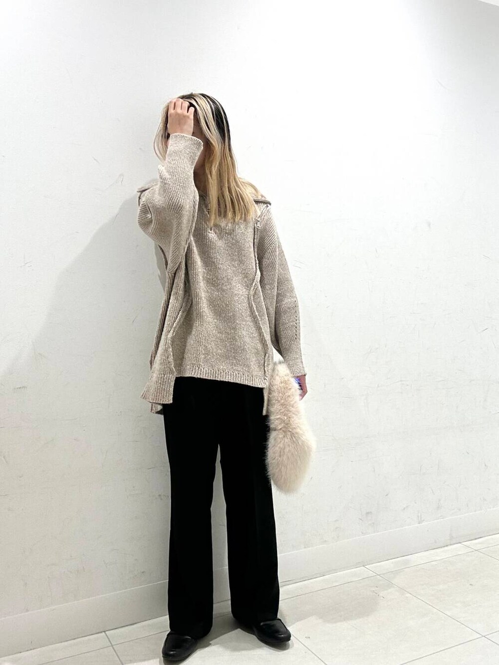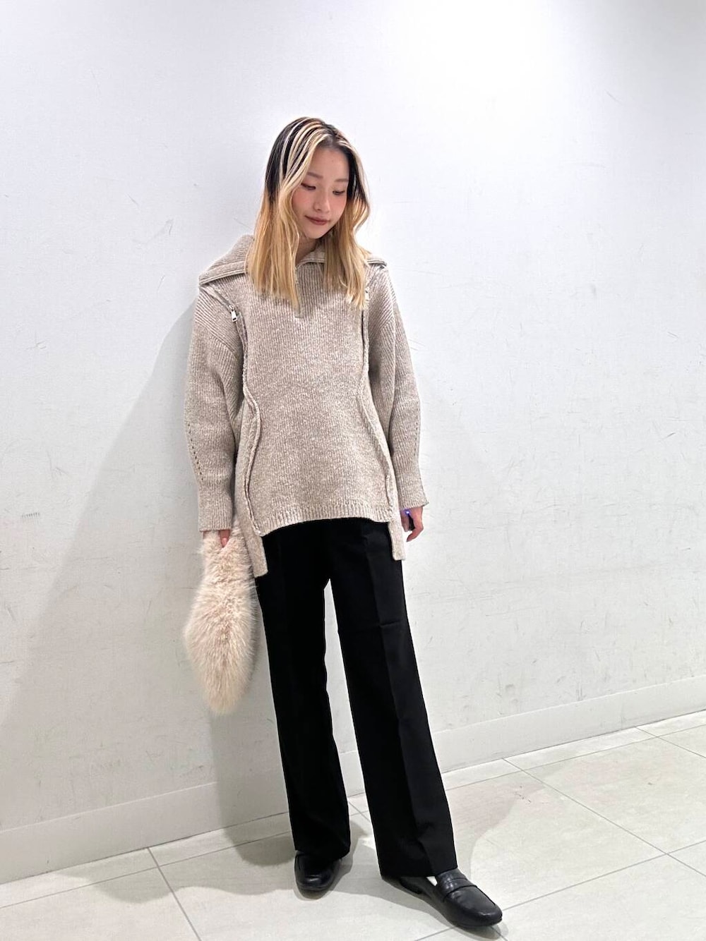 ベージュとブラックでまとめてシンプルだけどデザインがあるニットが主役のコーディネートです。
