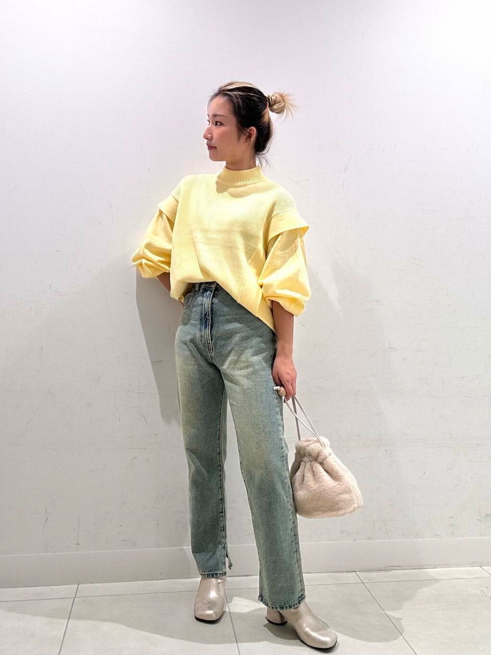 店頭でも人気のストレッチショルダータックセーターとチェックのマフラーのカジュアルスタイル
