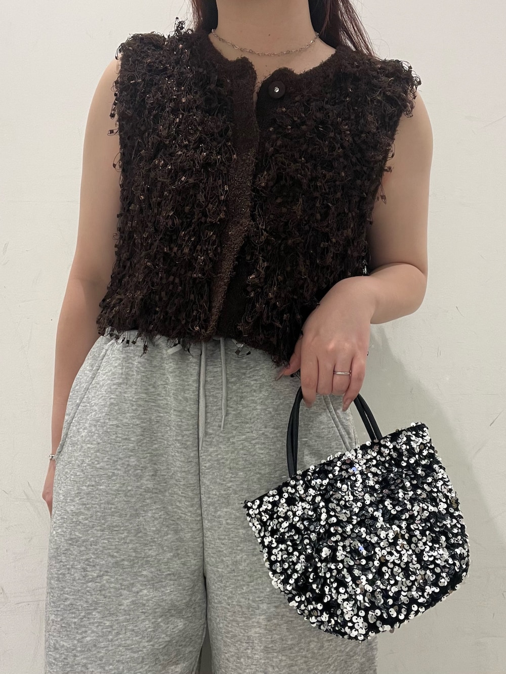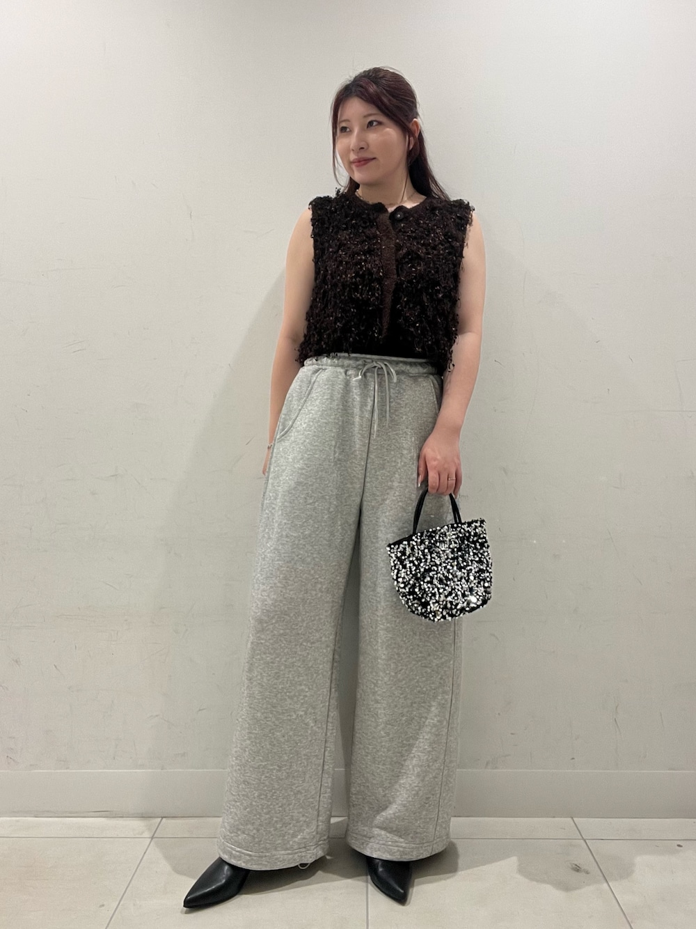1枚でもインナーやシャツ合わせでも使えるベストにスウェット合わせでラフめに♪ポインテッドのブーツやスパンコールのバックでお洒落感UP◎が
