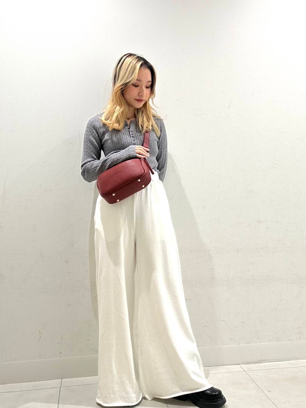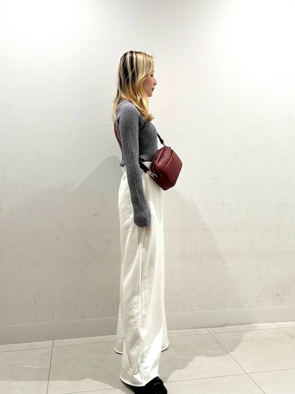 合わせたスウェットパンツはお好みの丈感でカットできるので低身長さんにもおすすめです。