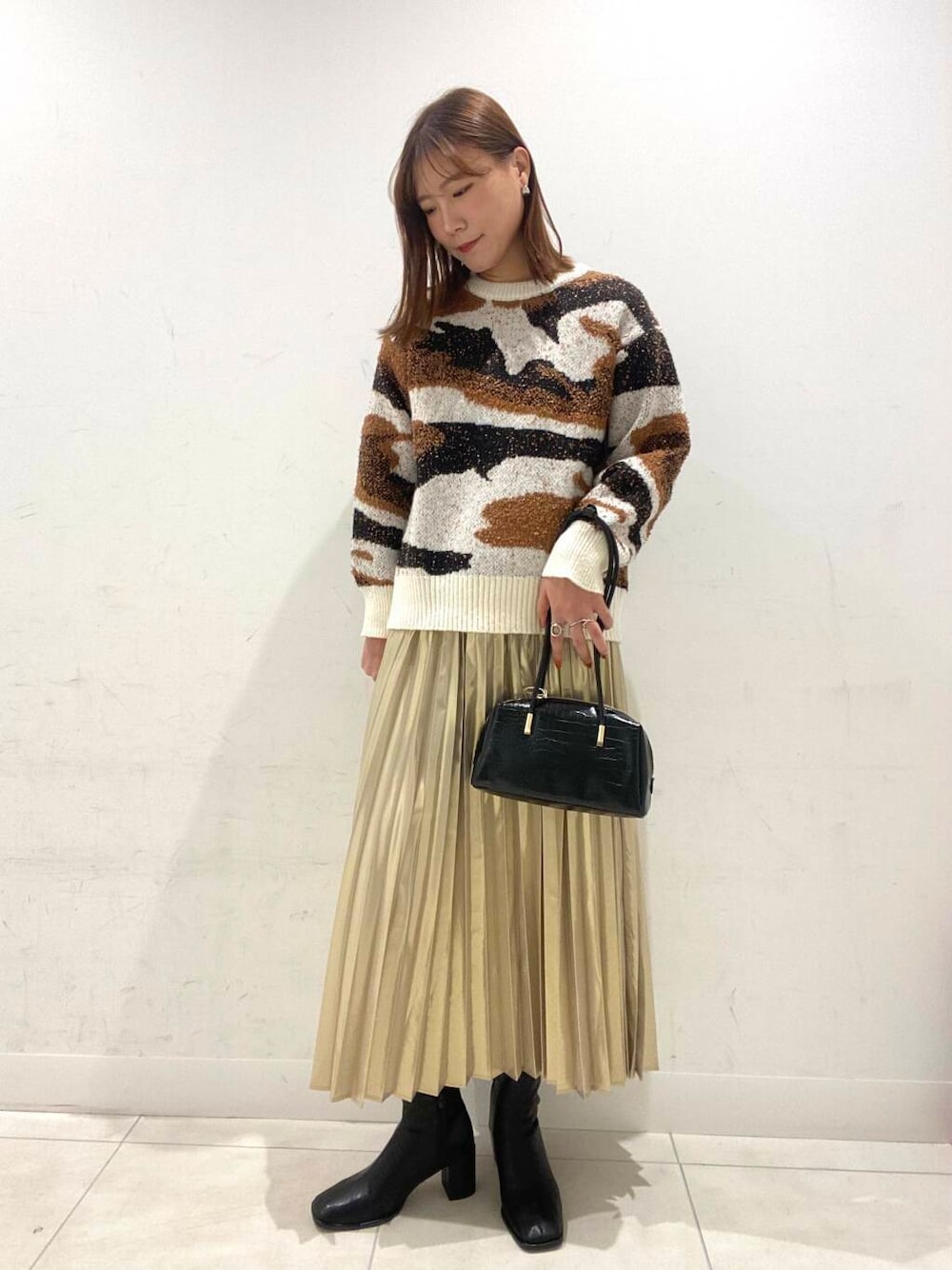 ゆったりとしたサイズ感でラメが入ったデザインがとてもかわいいニットと、プリーツスカートを合わせてみました!