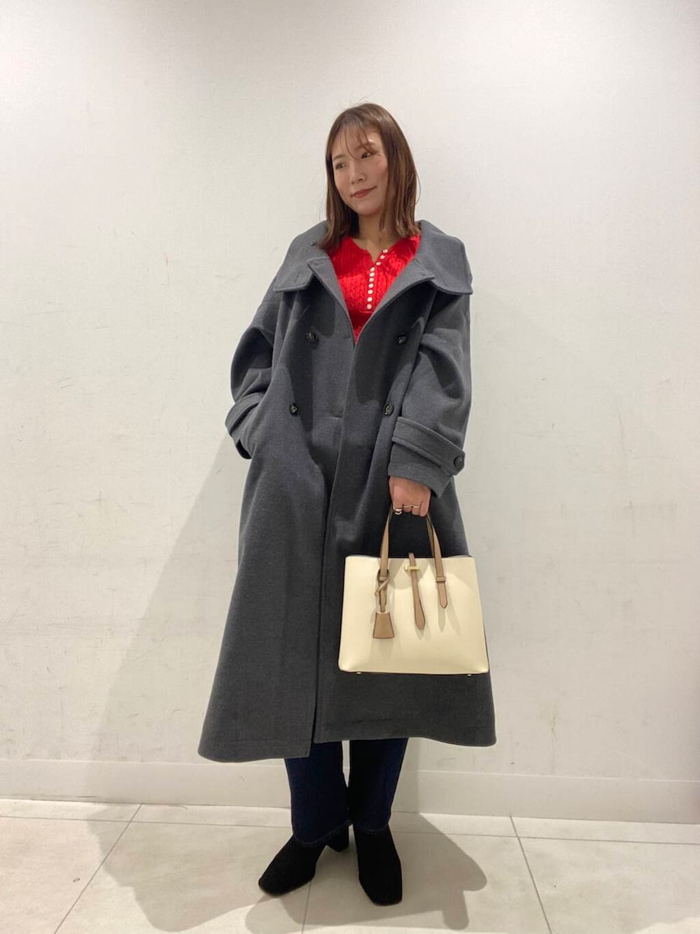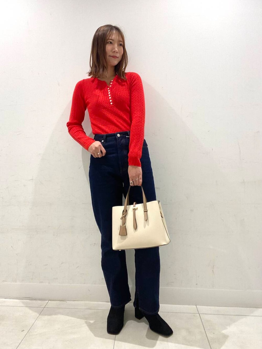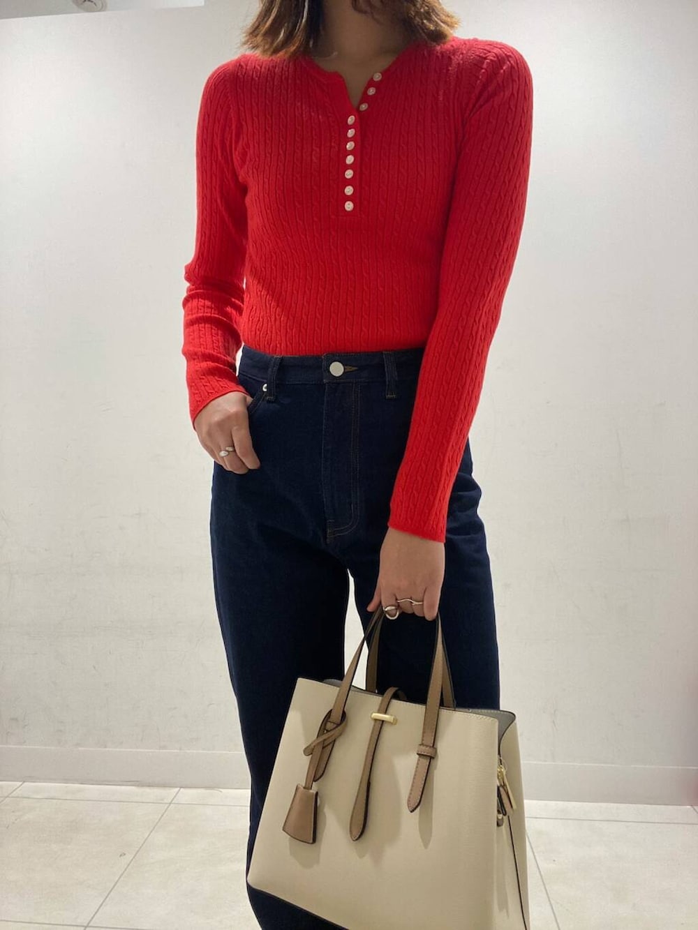 トップスのヘンリーネックセーターは首元のデザインがとってもかわいく、着心地も抜群です!