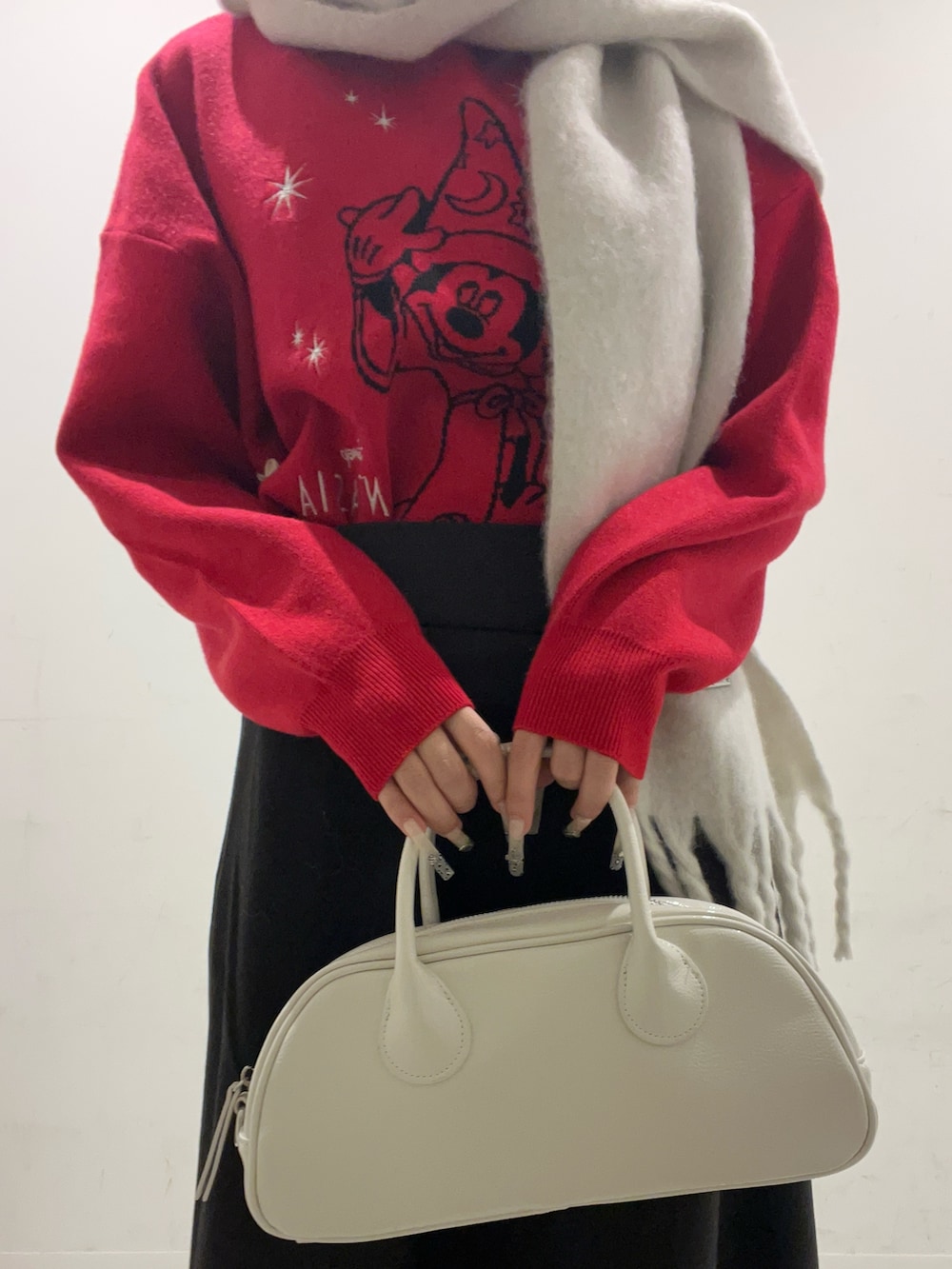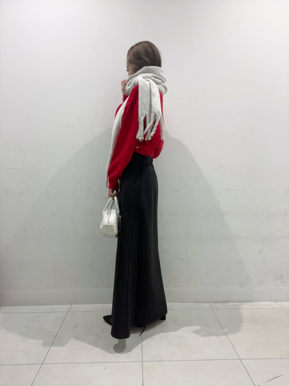 黒のスカートで全体を大人っぽく引き締めて、赤の存在感をきれいに引き立てました♡