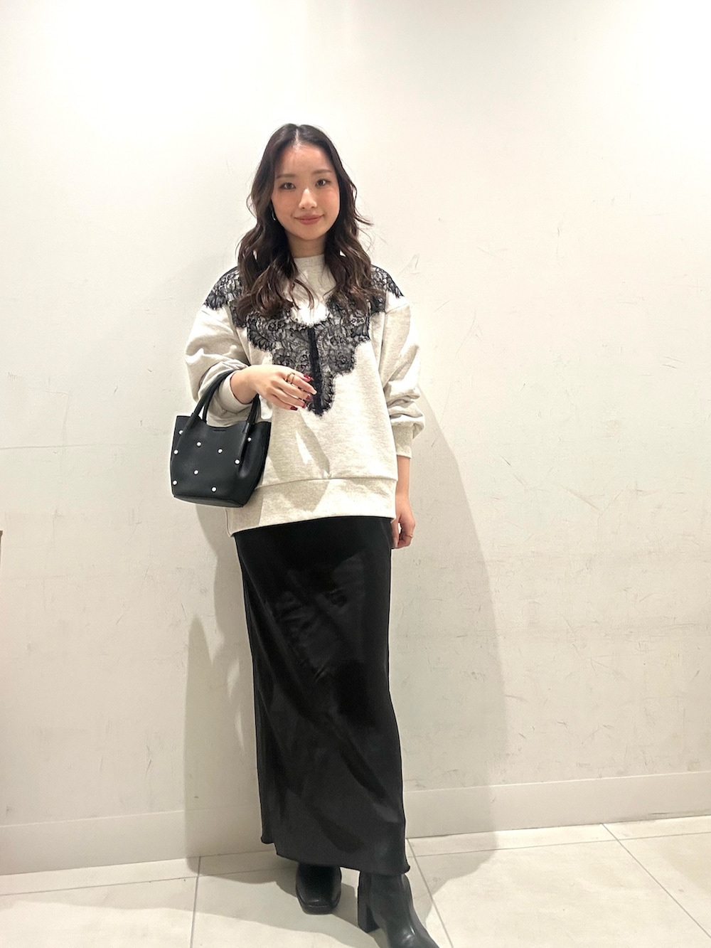 サテンのスカートはカジュアルなスウェットにも合う使いやすいアイテムです!