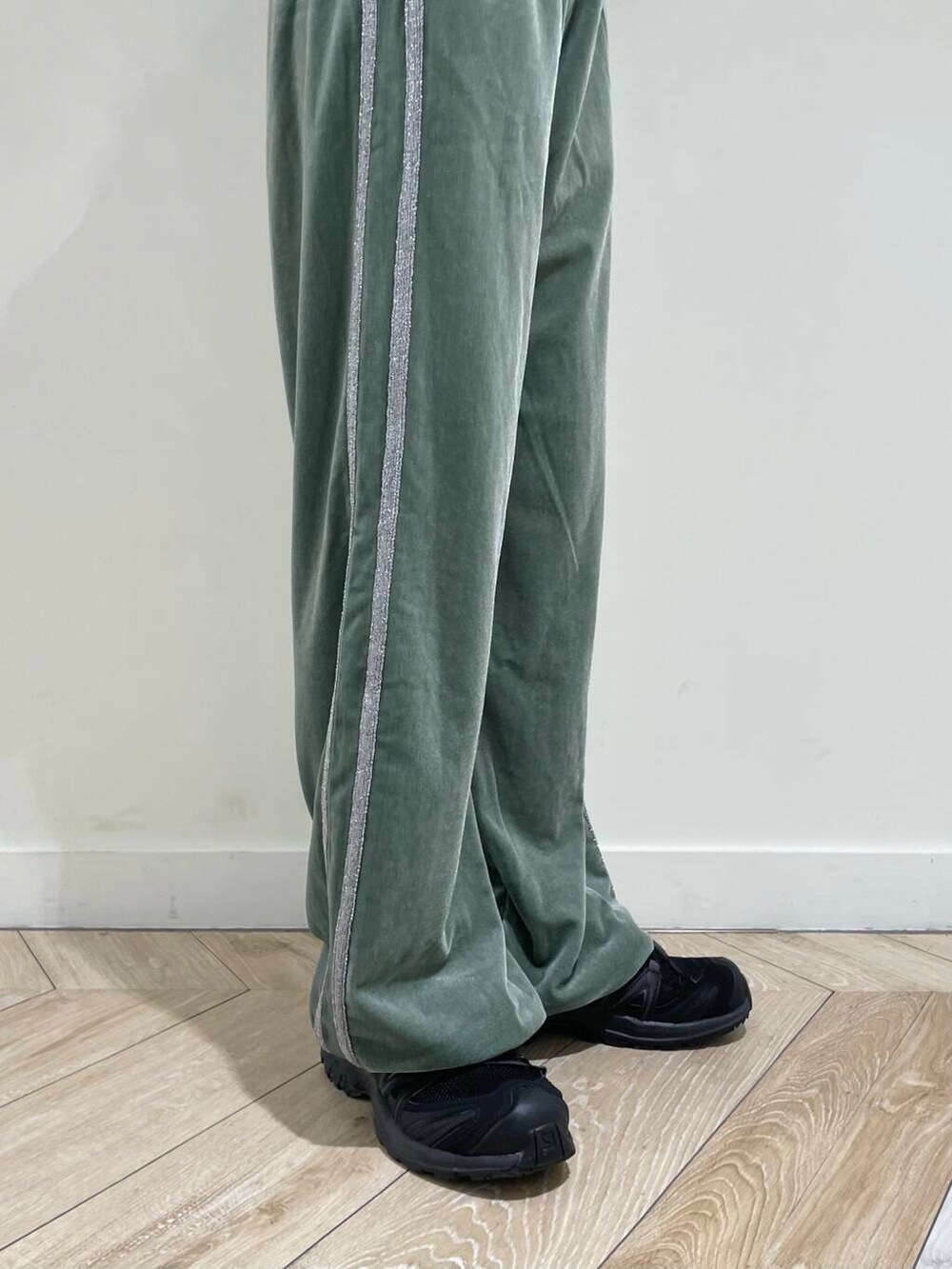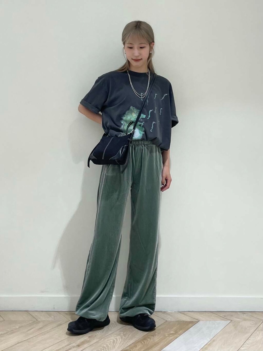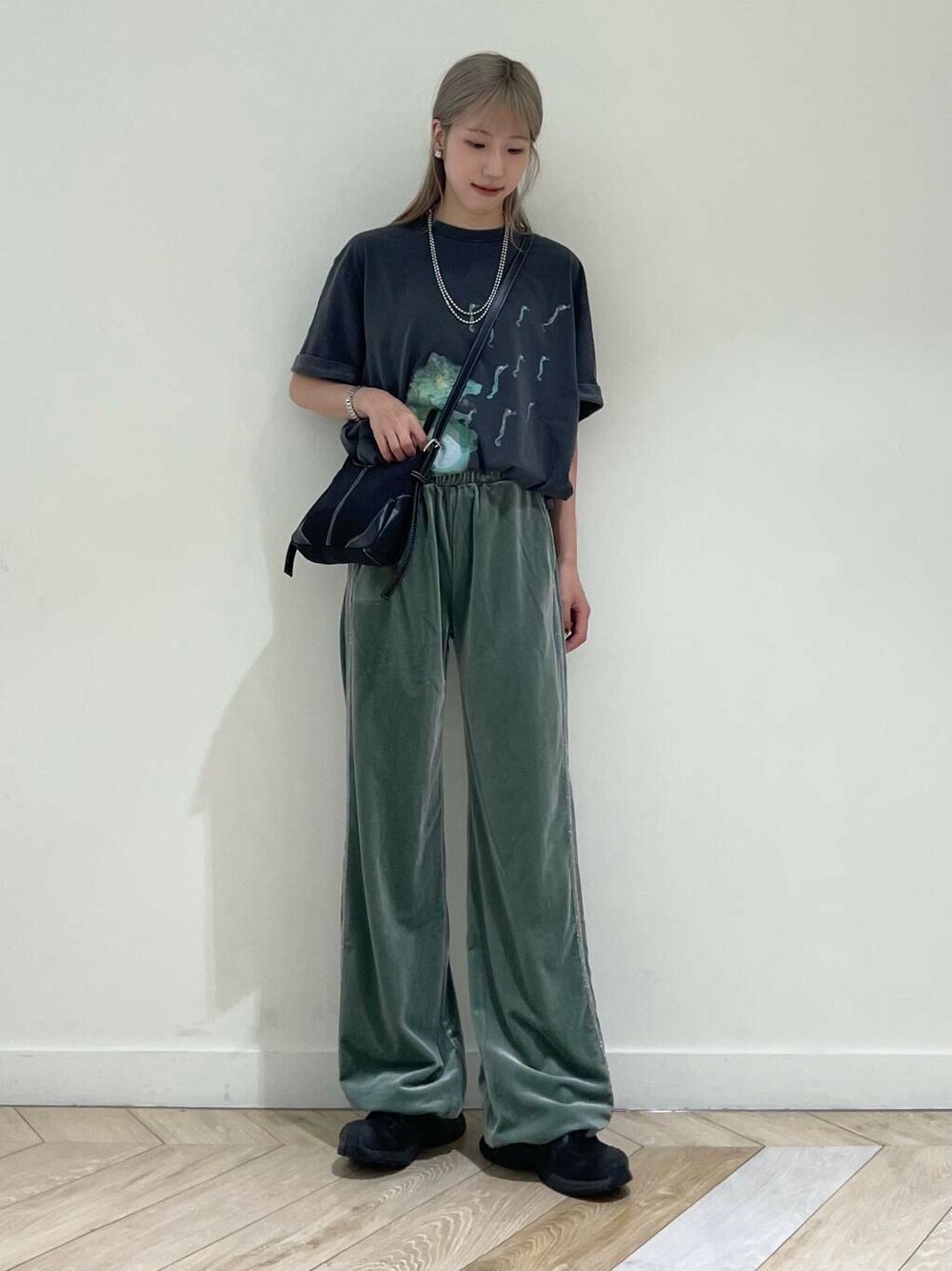 今回はベロアのパンツをメインにTシャツを合わせてグリーンのカラーがポイントの楽ちんコーデをしてみました♪