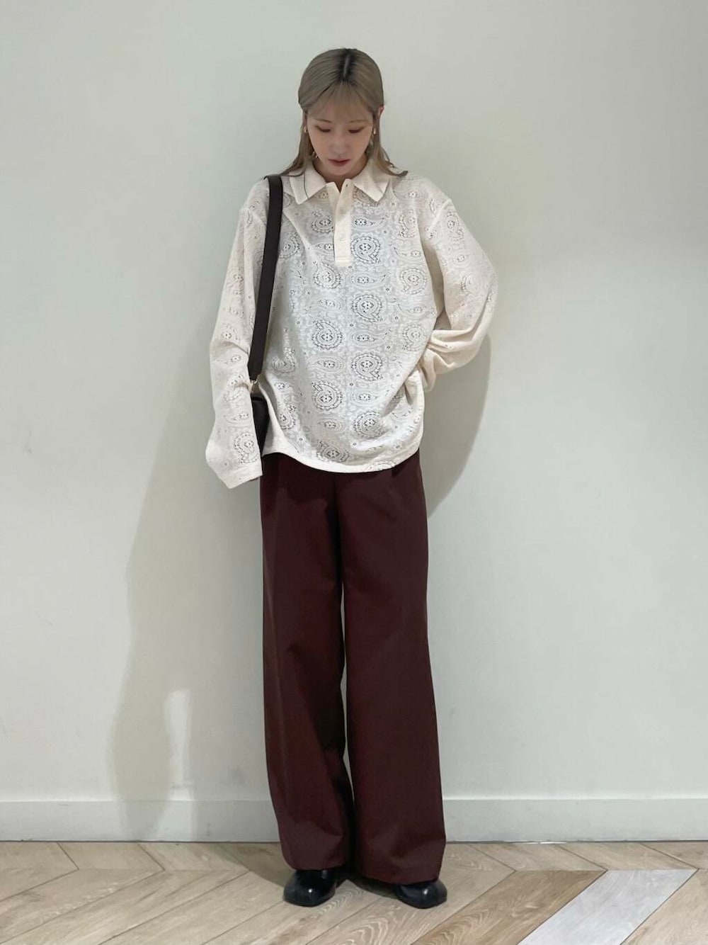 ブラウンのパンツを合わせて、