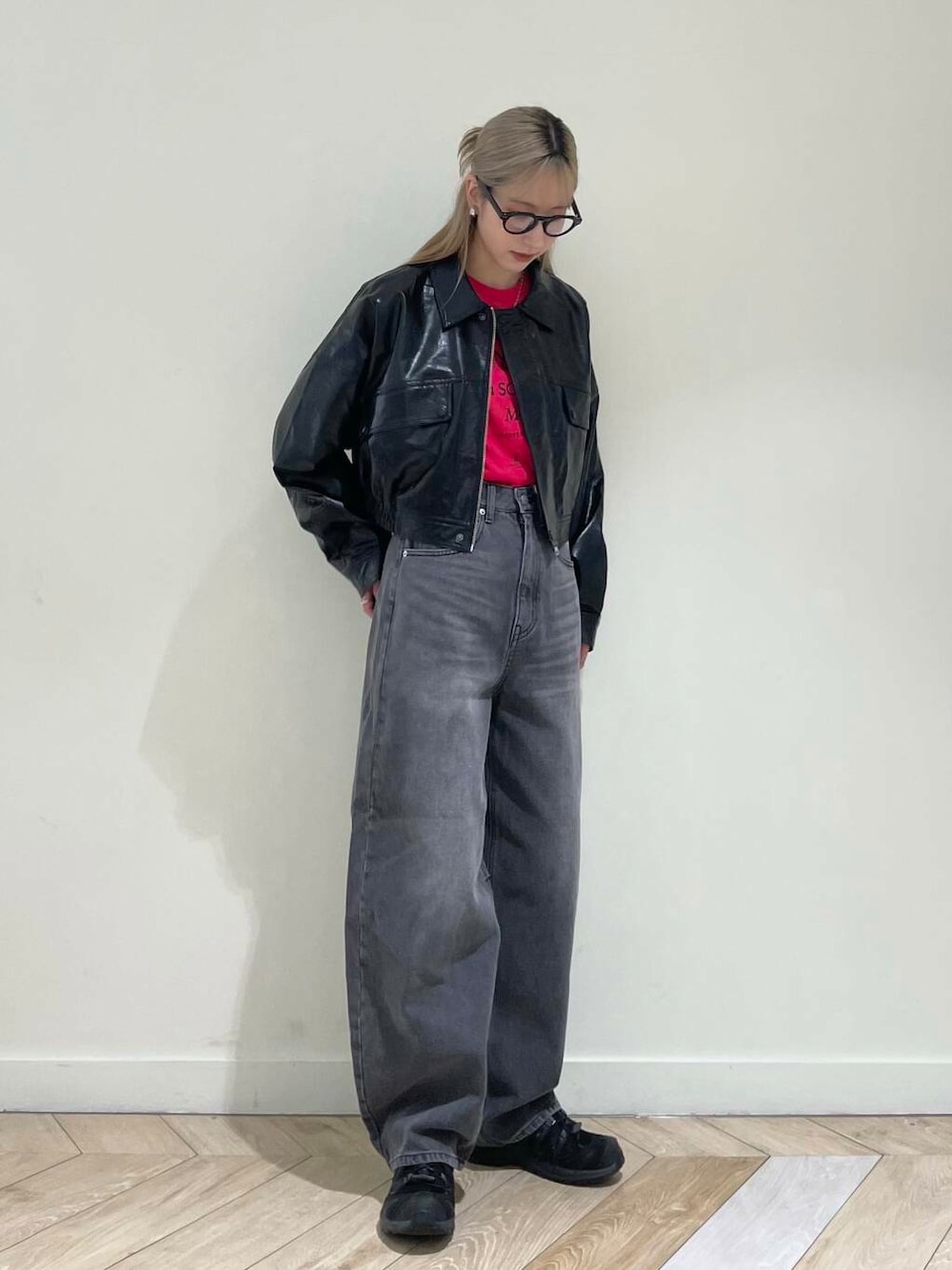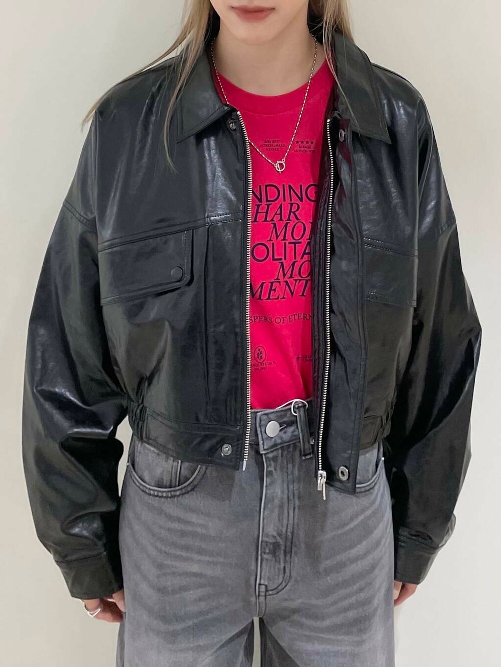 レザー風のジャケットはショート丈で、スッキリとした印象になります!