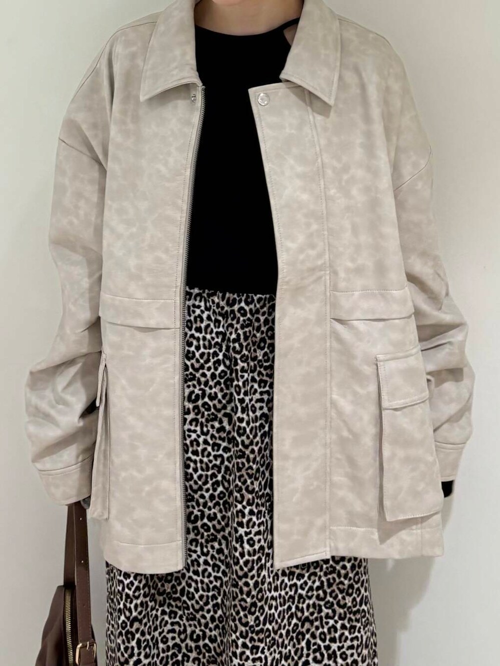 レザー風のジャケットはお袖がしっかり長めのオーバーシルエットで、厚手のニットを着てもさらっと羽織やすいです!