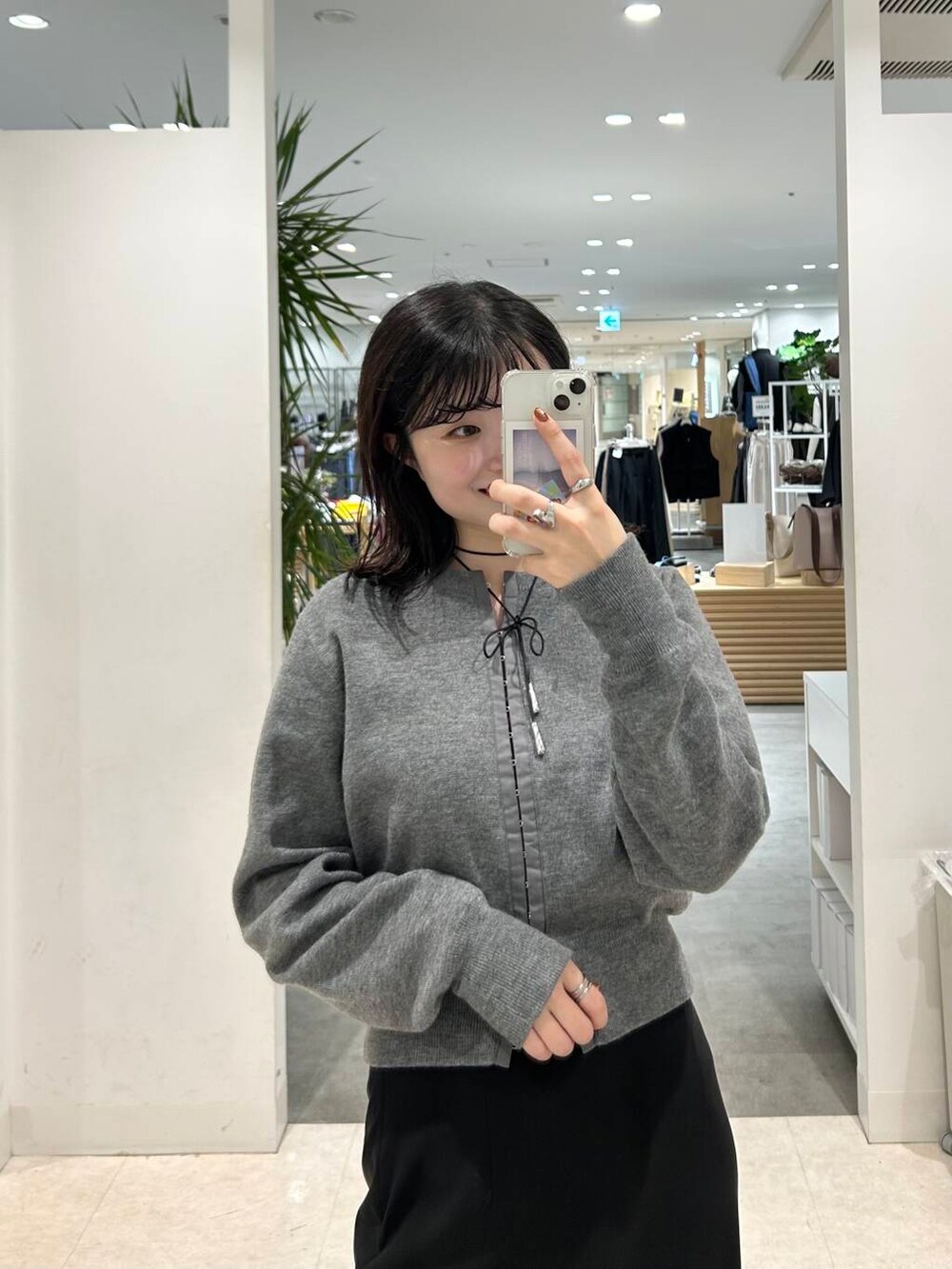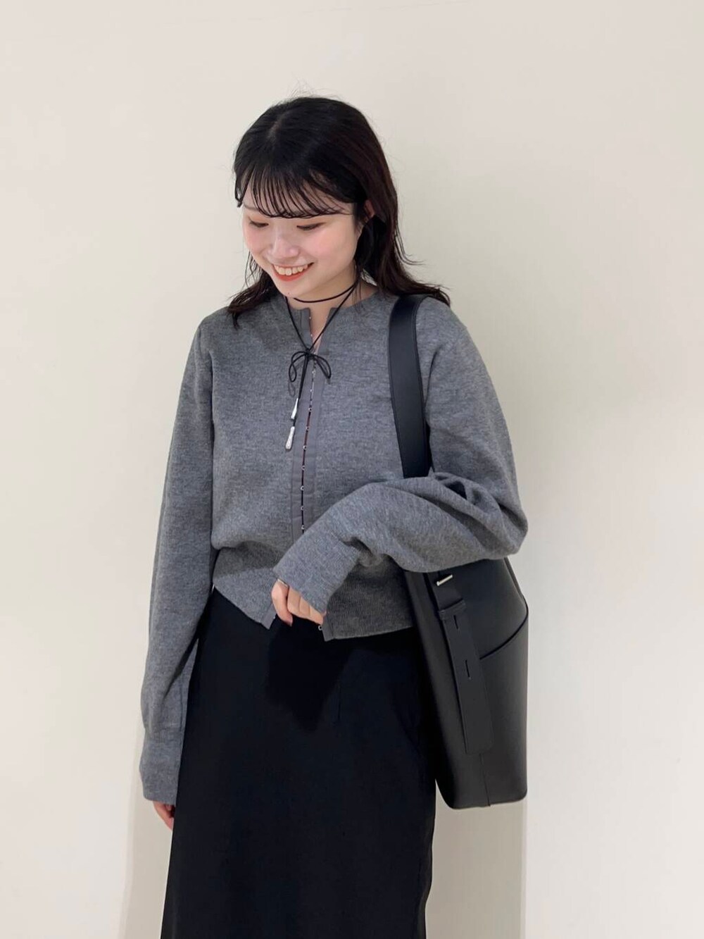 カーディガンはフロントホックのデザインでトレンド感はしっかり抑えつつ、シンプルでオフィスでもお使いいただけるので一枚あると便利ですよ〜♡