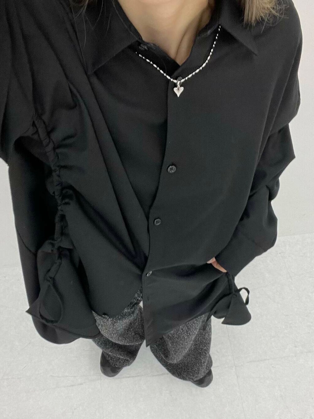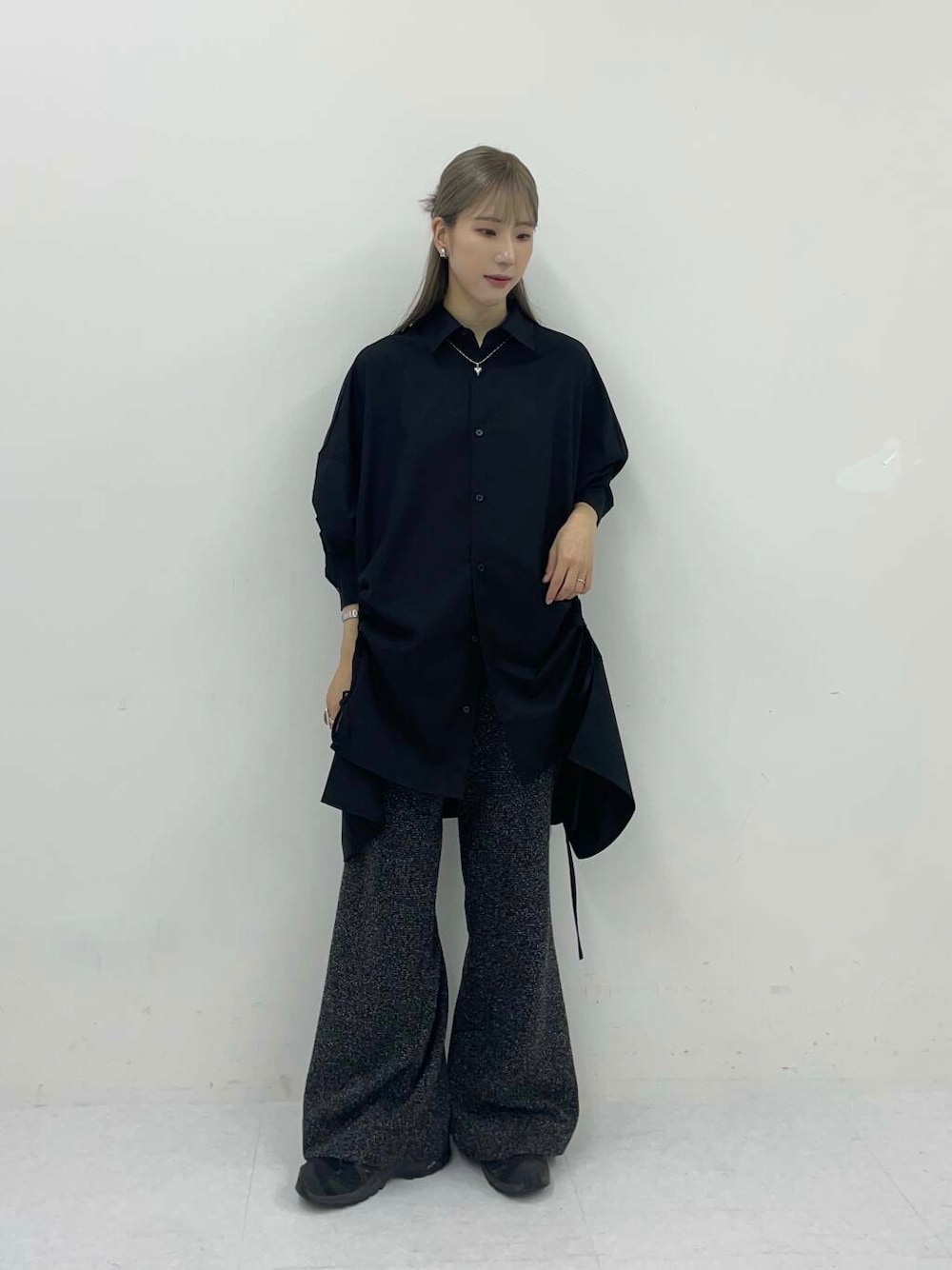 こちらのシャツはルーズなシルエットで、162㎝が着用するとチュニック丈ぐらいの長さになります!