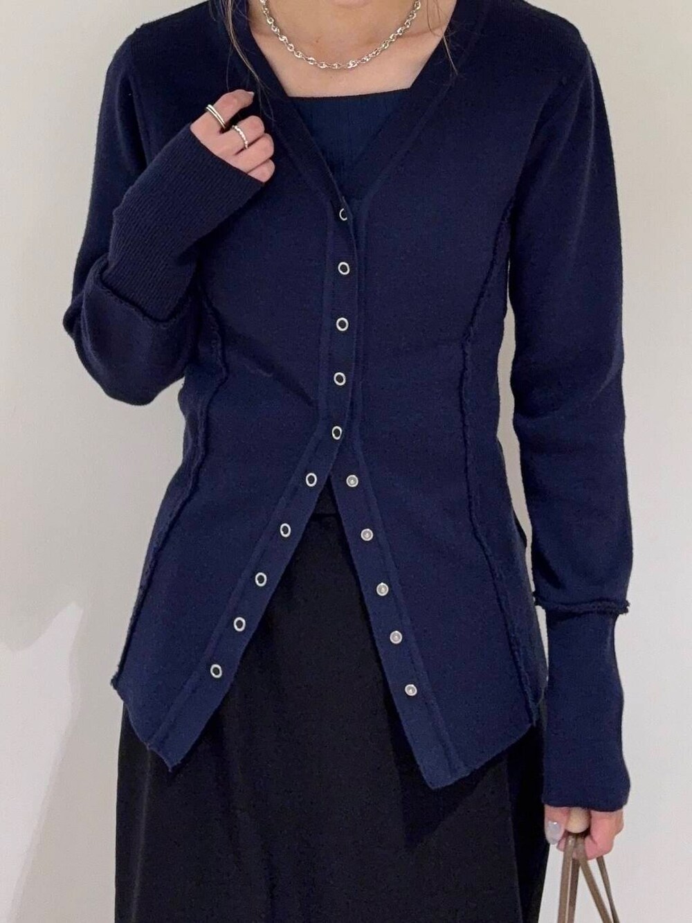 フロントのシルバーのスナップボタンがアクセサリーのような華やかさがあり、サイドのカーブデザインがくびれがあるように見せてくれますよ♡