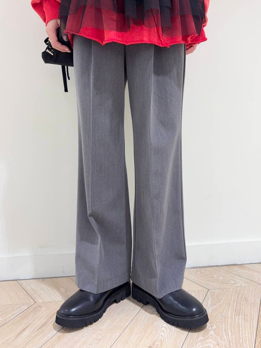 カラー物と相性抜群なグレーのスラックスは、黒よりも色の印象を和らげてくれるので1枚持っておくと重宝しますよ♡
