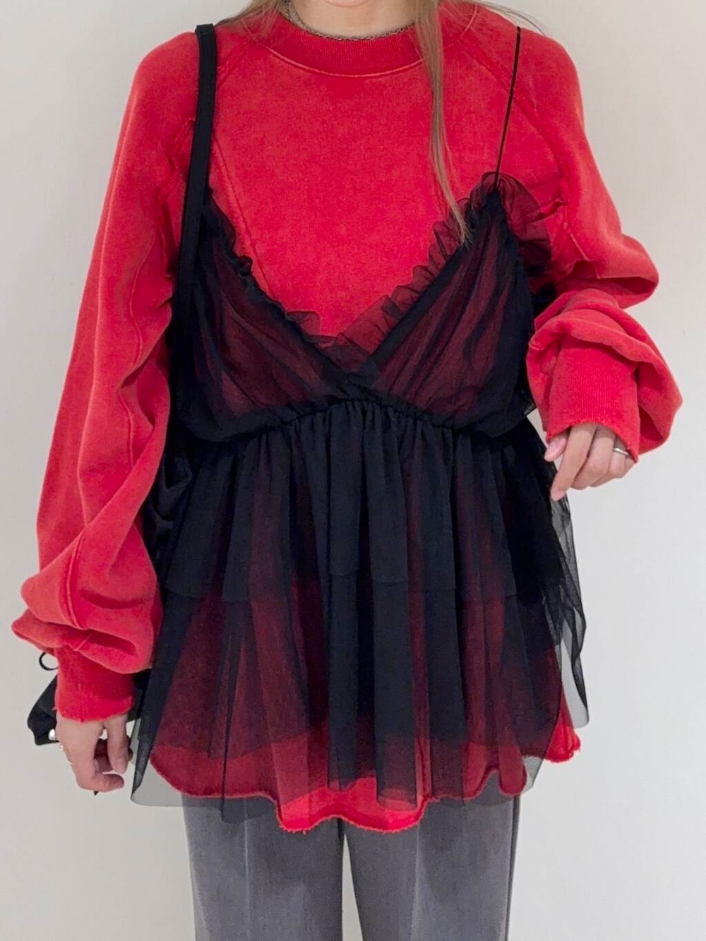 チュールのビスチェはウエスト部分がゴムになっているので、多少厚めな生地の上からでも着られます!アウターを羽織ってもチュールがチラッと見えるのが可愛いです♡