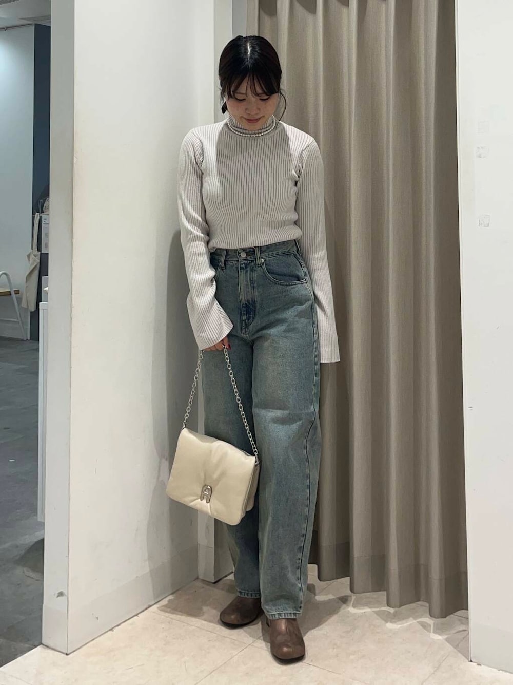 お袖がフレアになっているタートルセーター。着用しているホワイトは真っ白すぎず少しベージュがかっていて、甘めコーデにもきれいめなコーデにも合わせられます♡