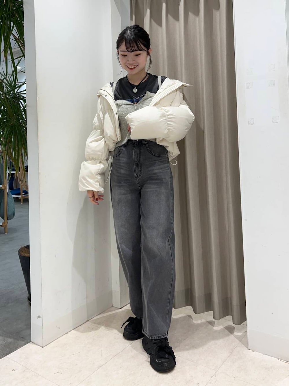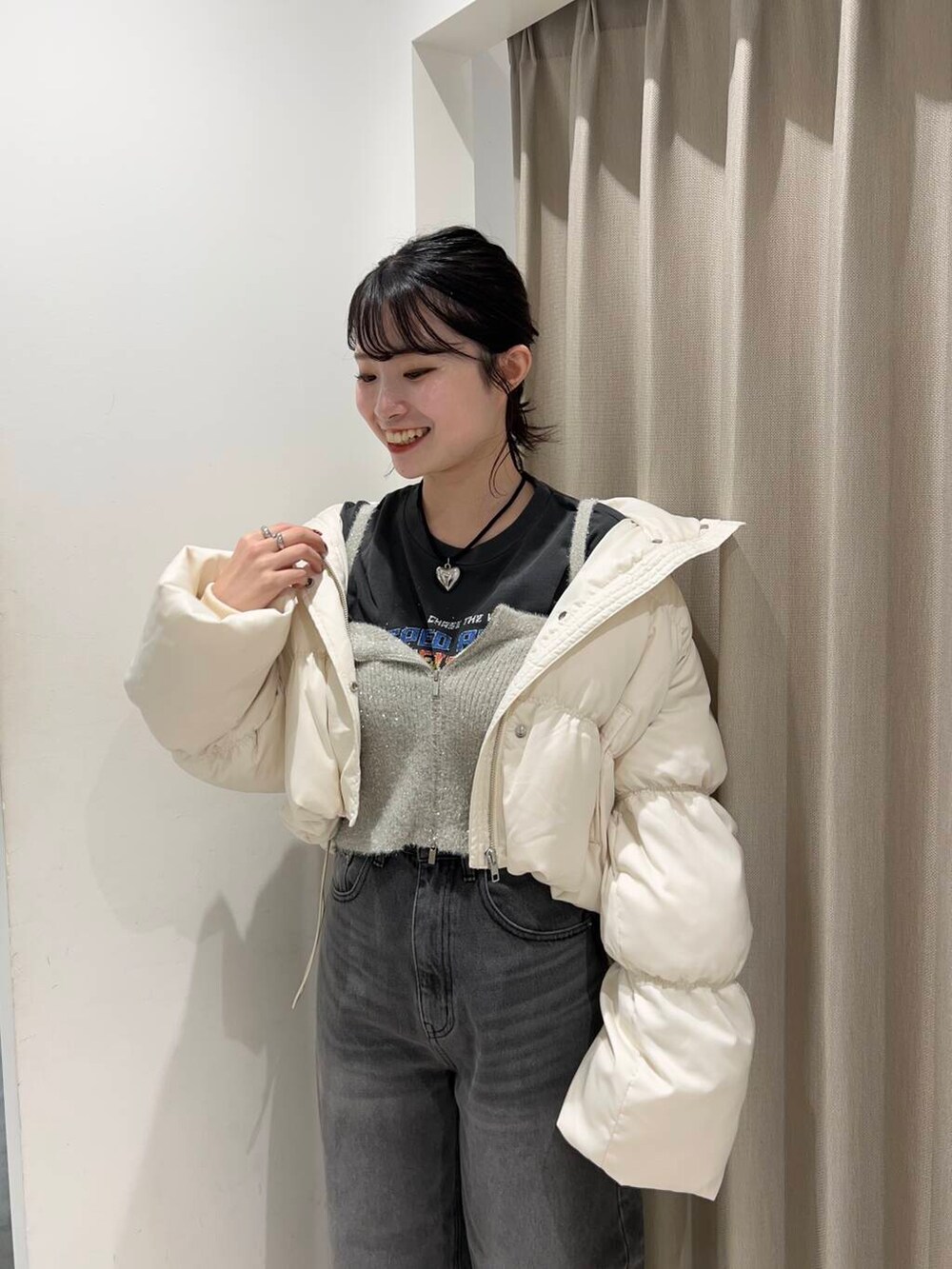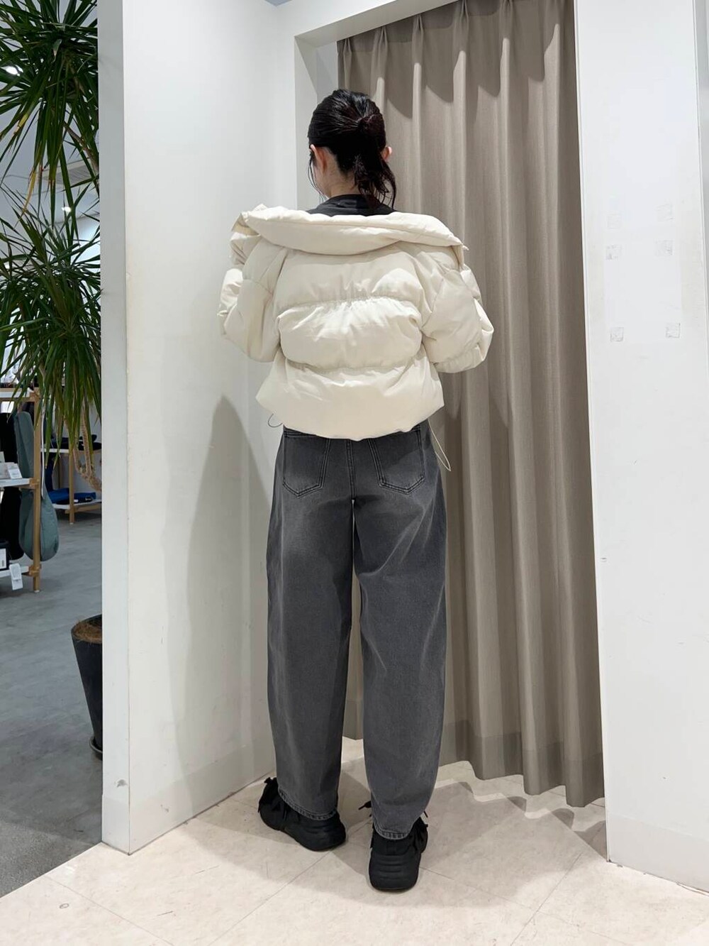 ショート丈のダウンは脚長効果で