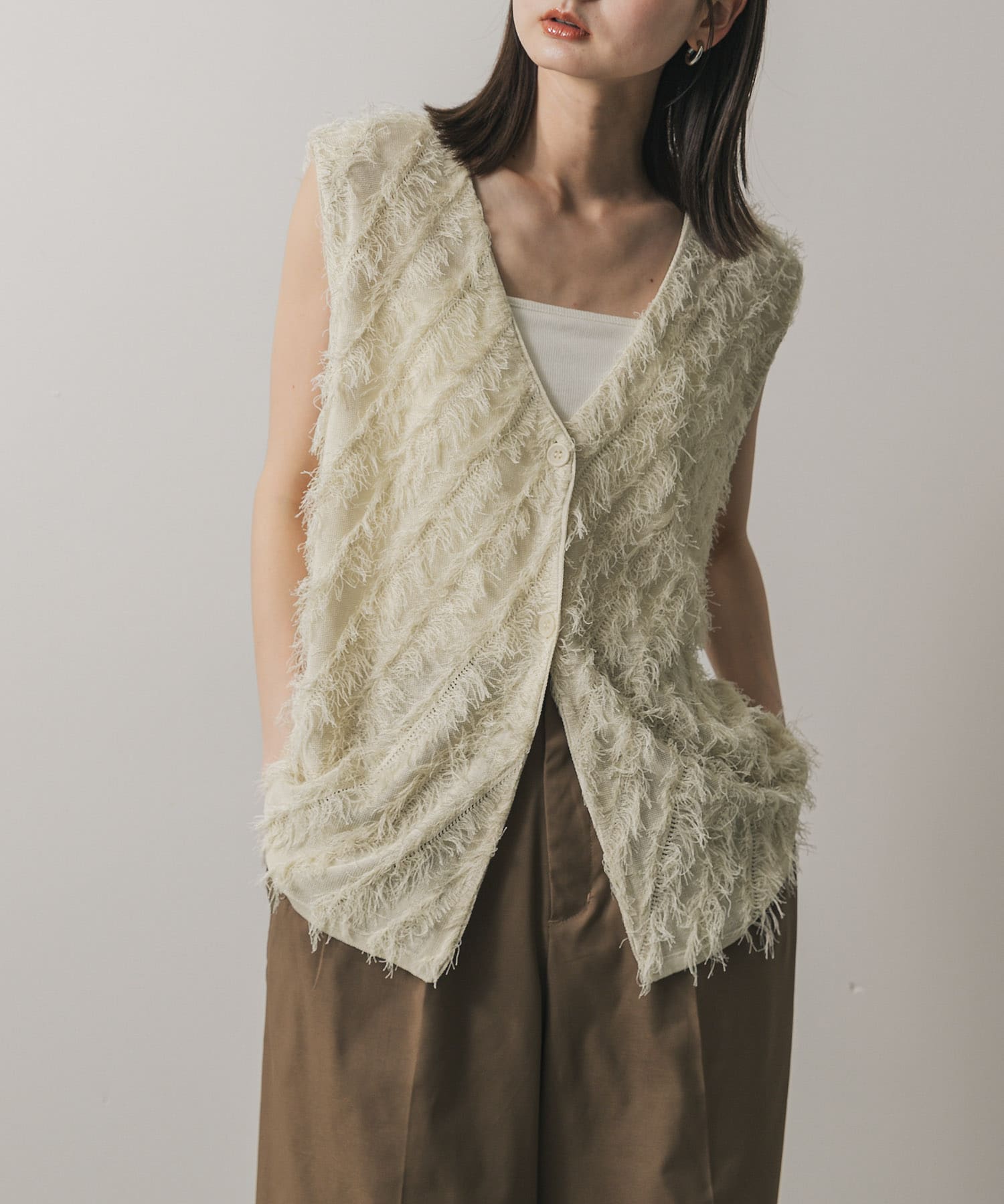 ジレベストは、薄手のフリンジ素材で夏のレイヤードコーデにぴったりです!
