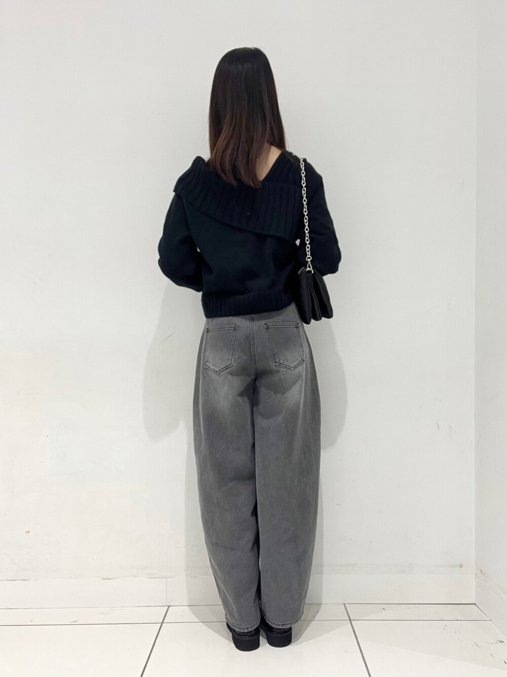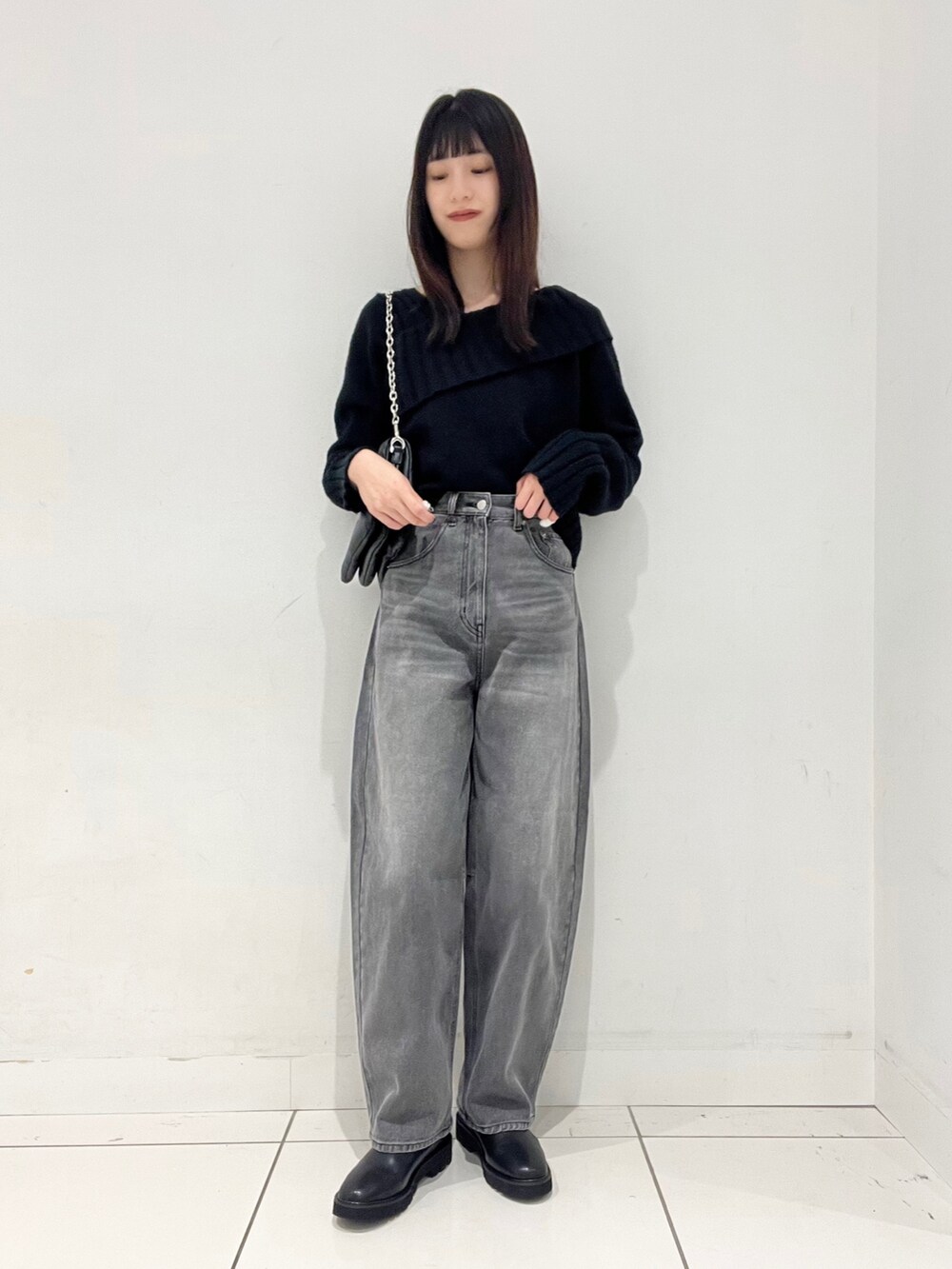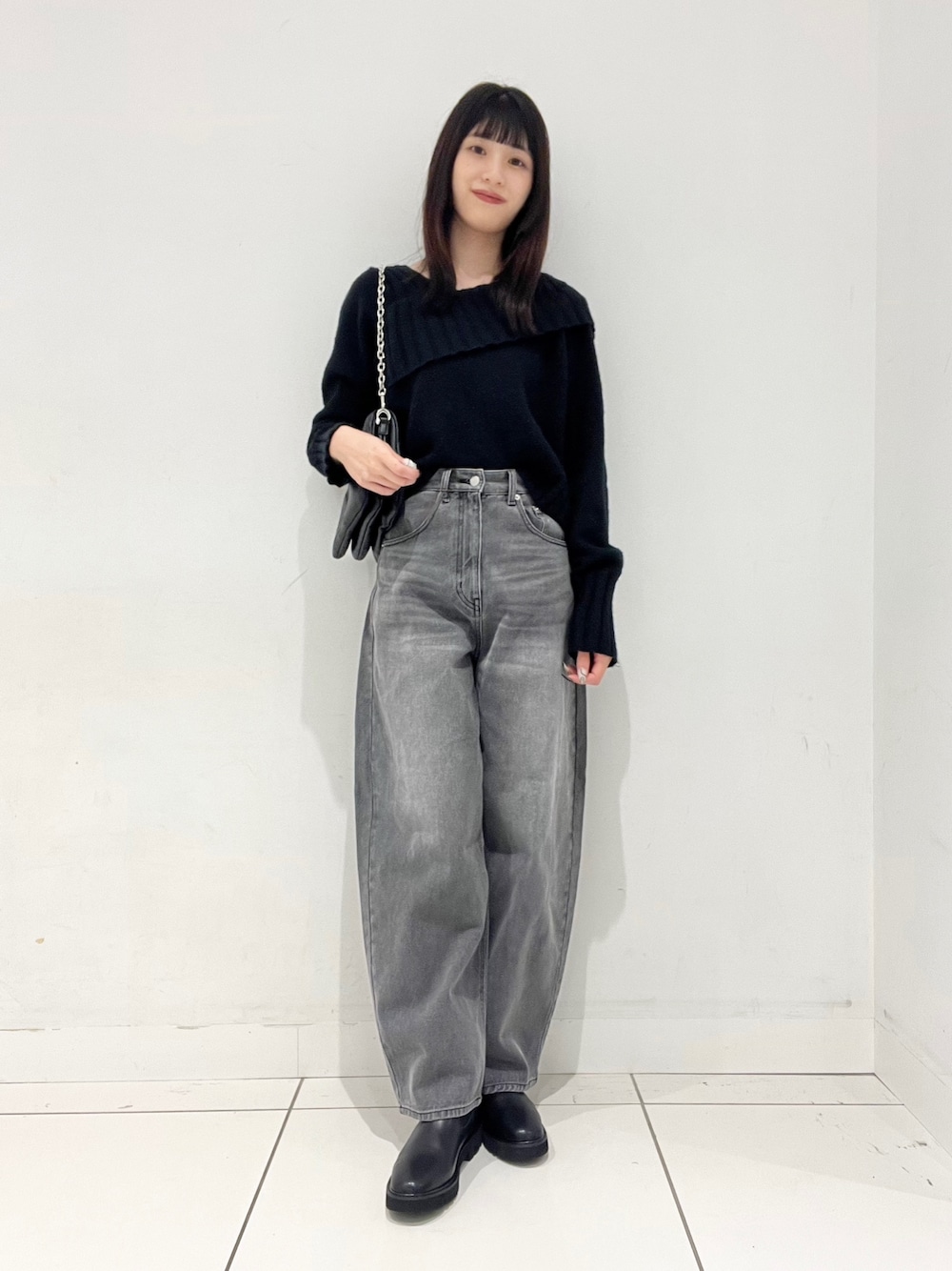 トップスは首元スッキリとしたオフショルニットで上品さとラフさを出しています✨️