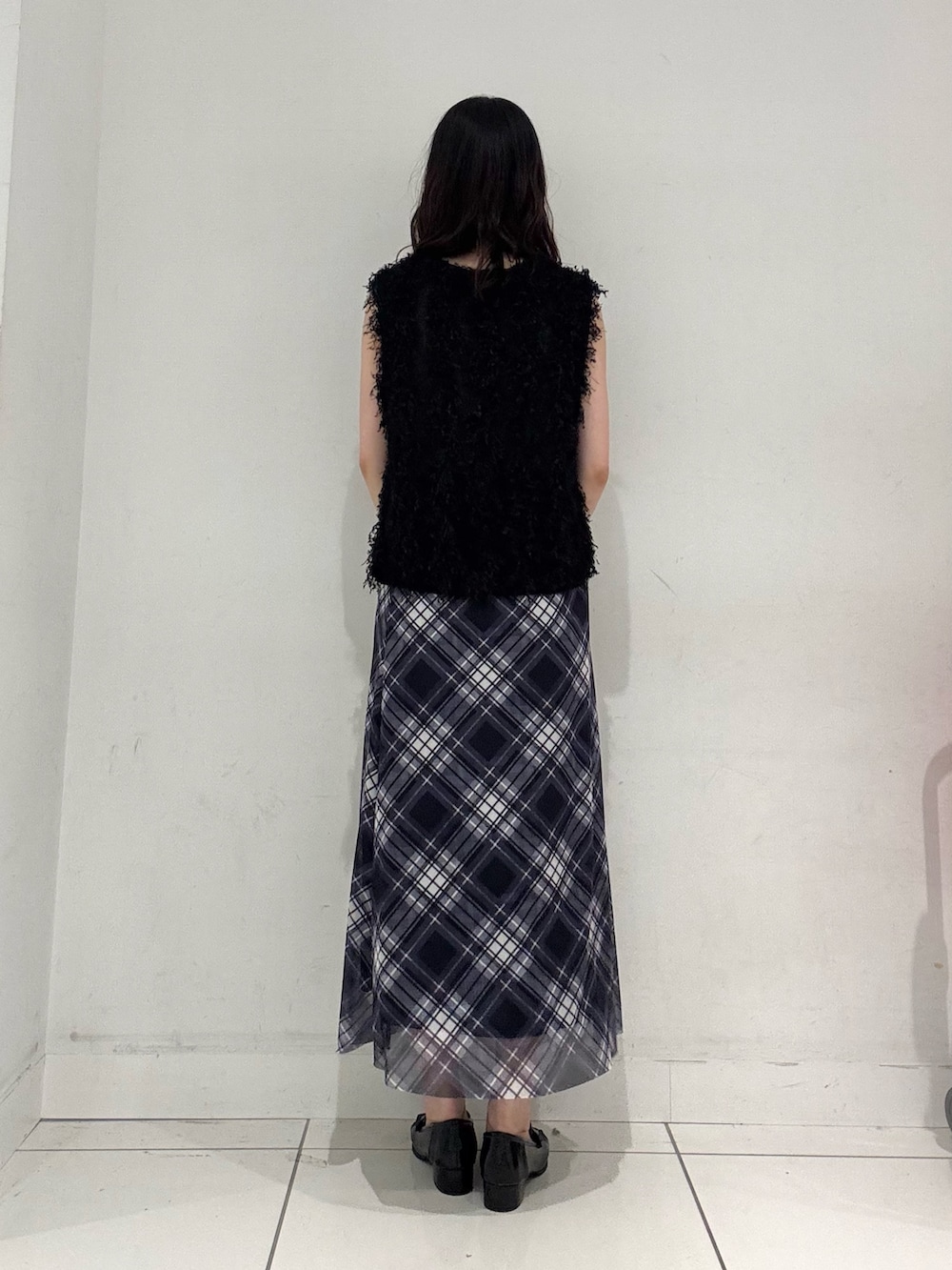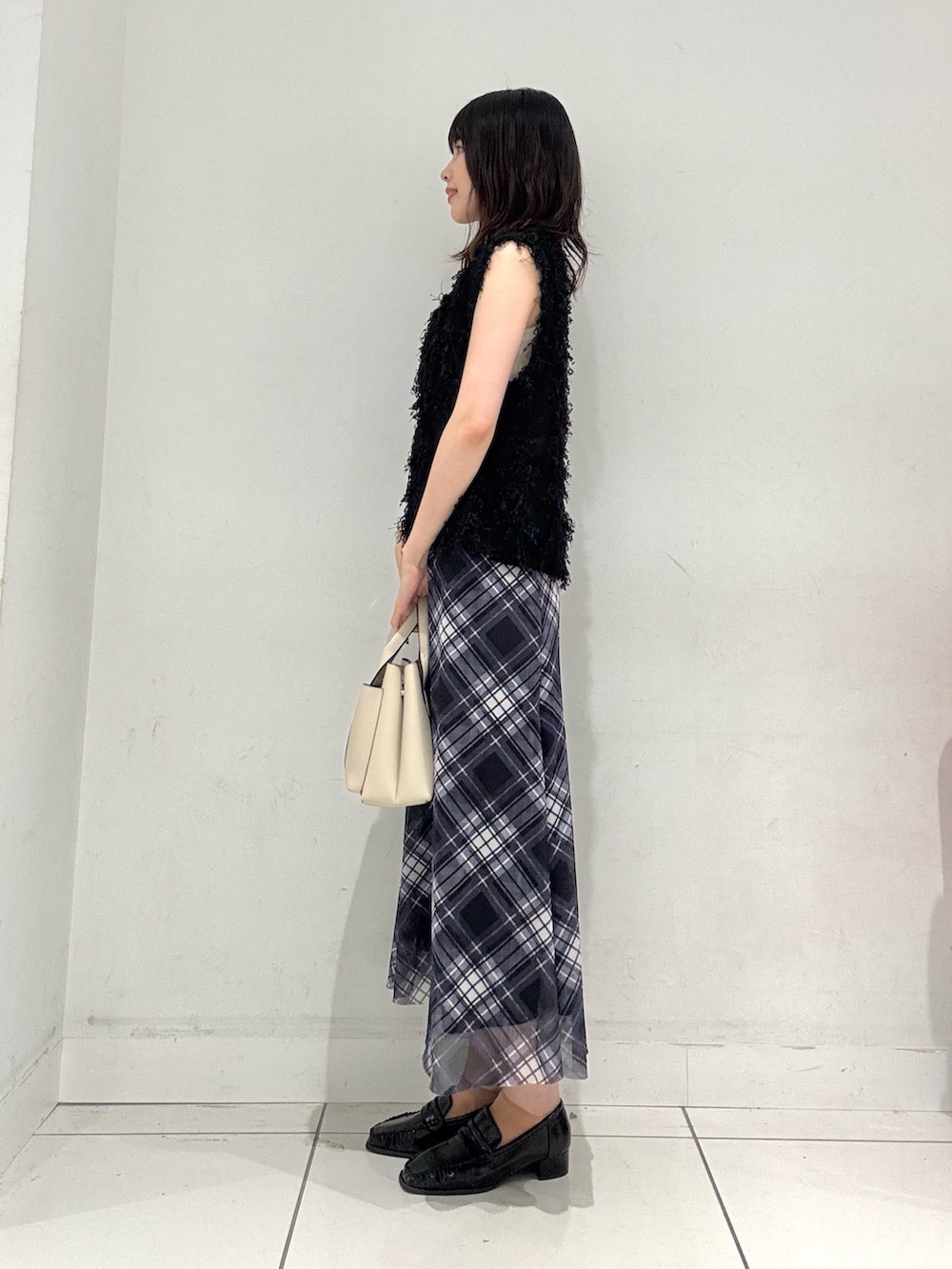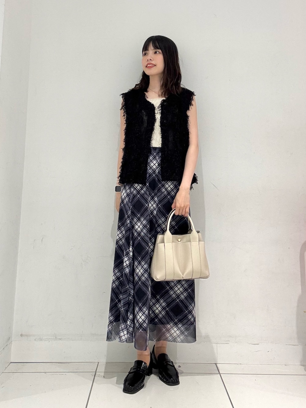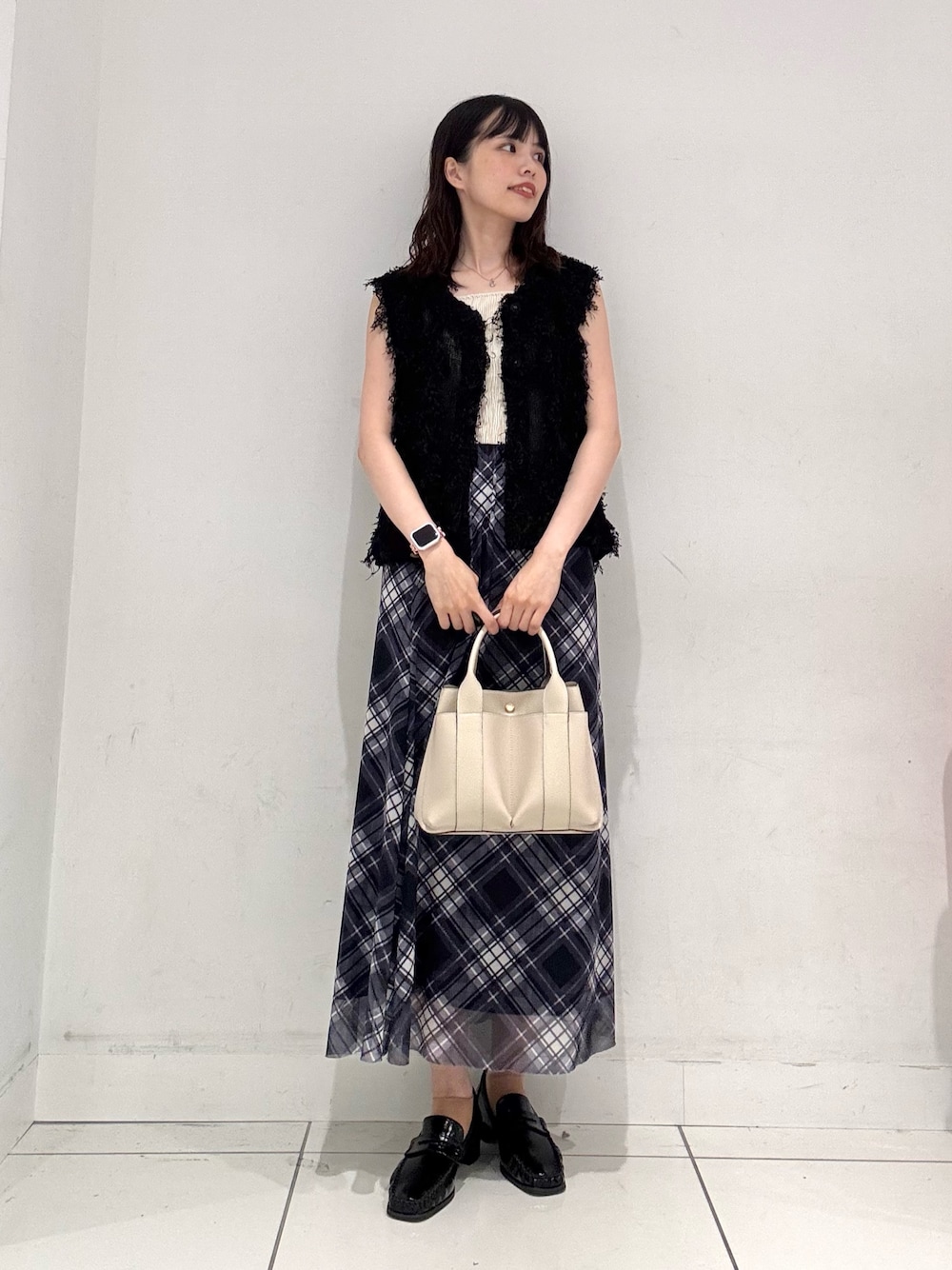 今の時期はインナーをキャミで合わせて、涼しくなったらシアー感のある長袖トップスと合わせると、長い期間着用いただけます◎