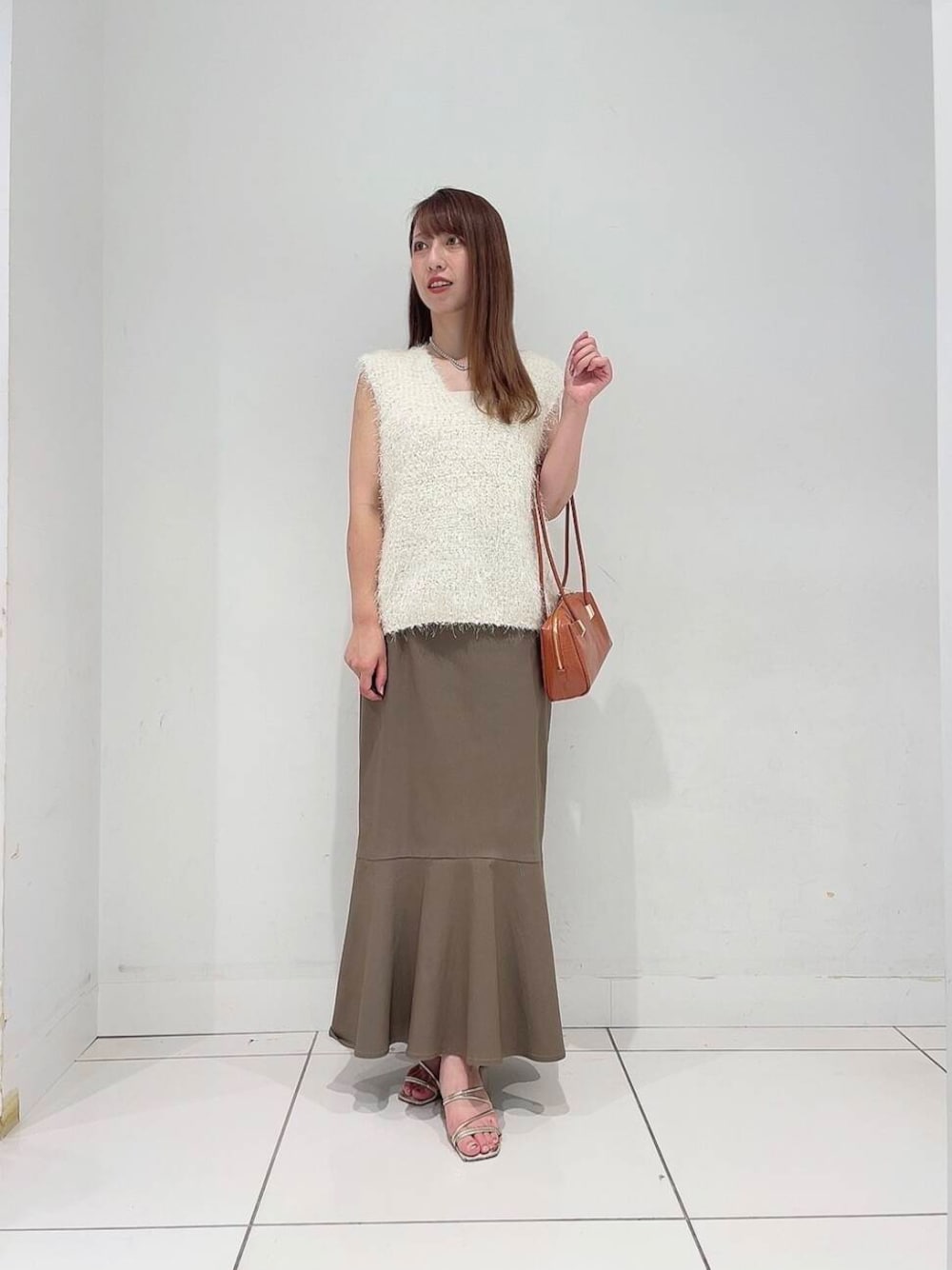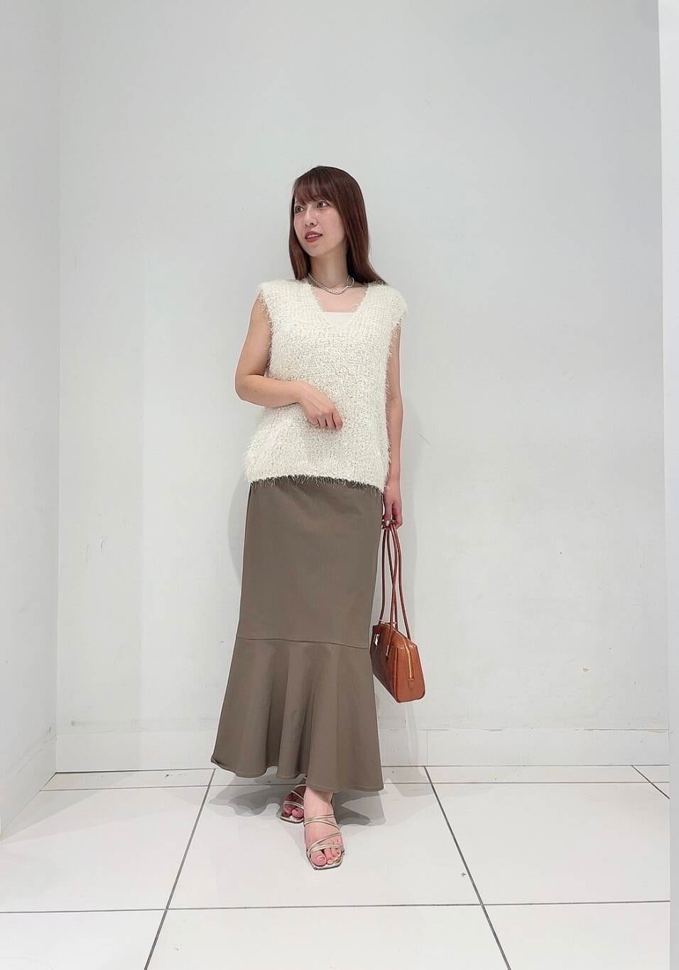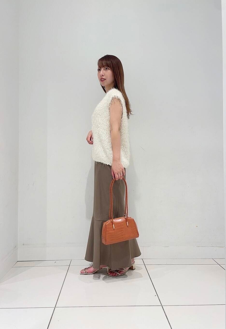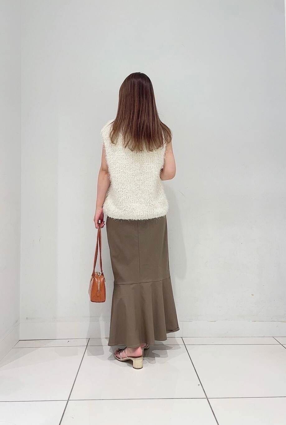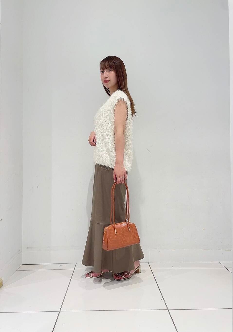 いつものコーデに変化を付けるニットベスト。ミックス糸で立体感もありグッと季節感をプラスしてくれます。ツヤっとした細かいラメのような光沢感もポイントです。晩夏はキャミソールや半袖、秋口には薄手のシアートップスとの組み合わせがオススメです〇