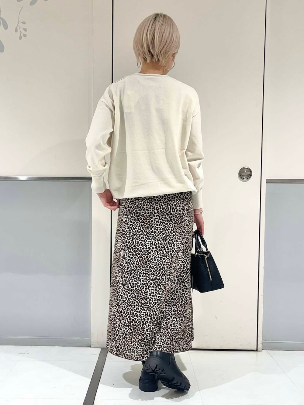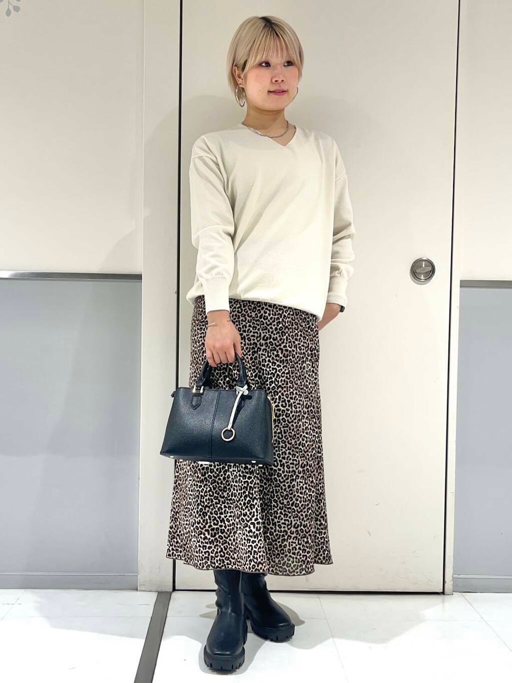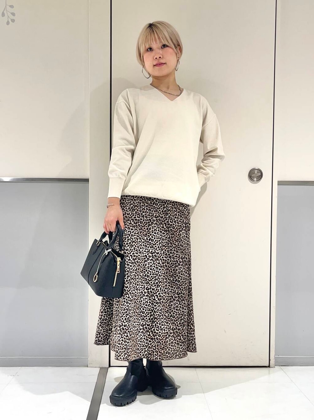 トップスのセーターはVネックなので首元スッキリ✨ ネックレスが映えます◎