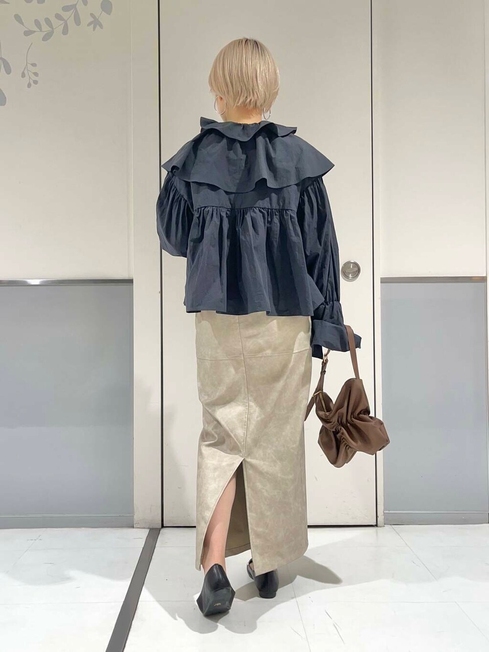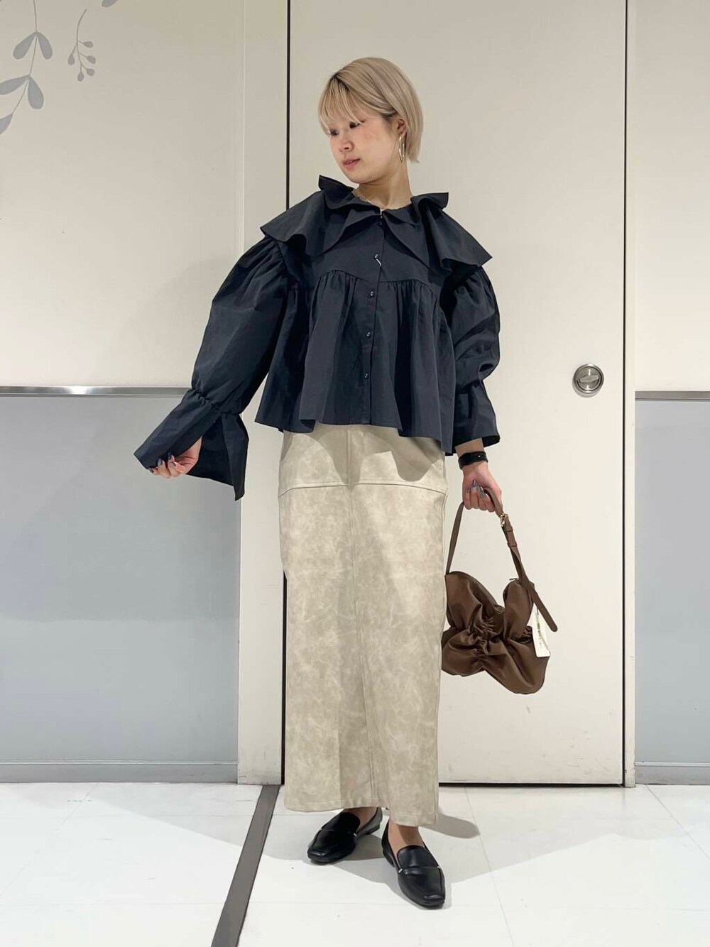 ボトムは合皮のスカート!高みえしますし、履き心地も腰周りオールゴムでゆったりなのにIラインの形なので綺麗に見えます✨