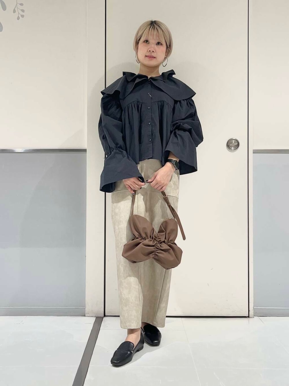 トップスはフリルが沢山のブラウスですが、落ち着いている色になってるので派手すぎず着ていただけます(*ˊ˘ˋ*)♡