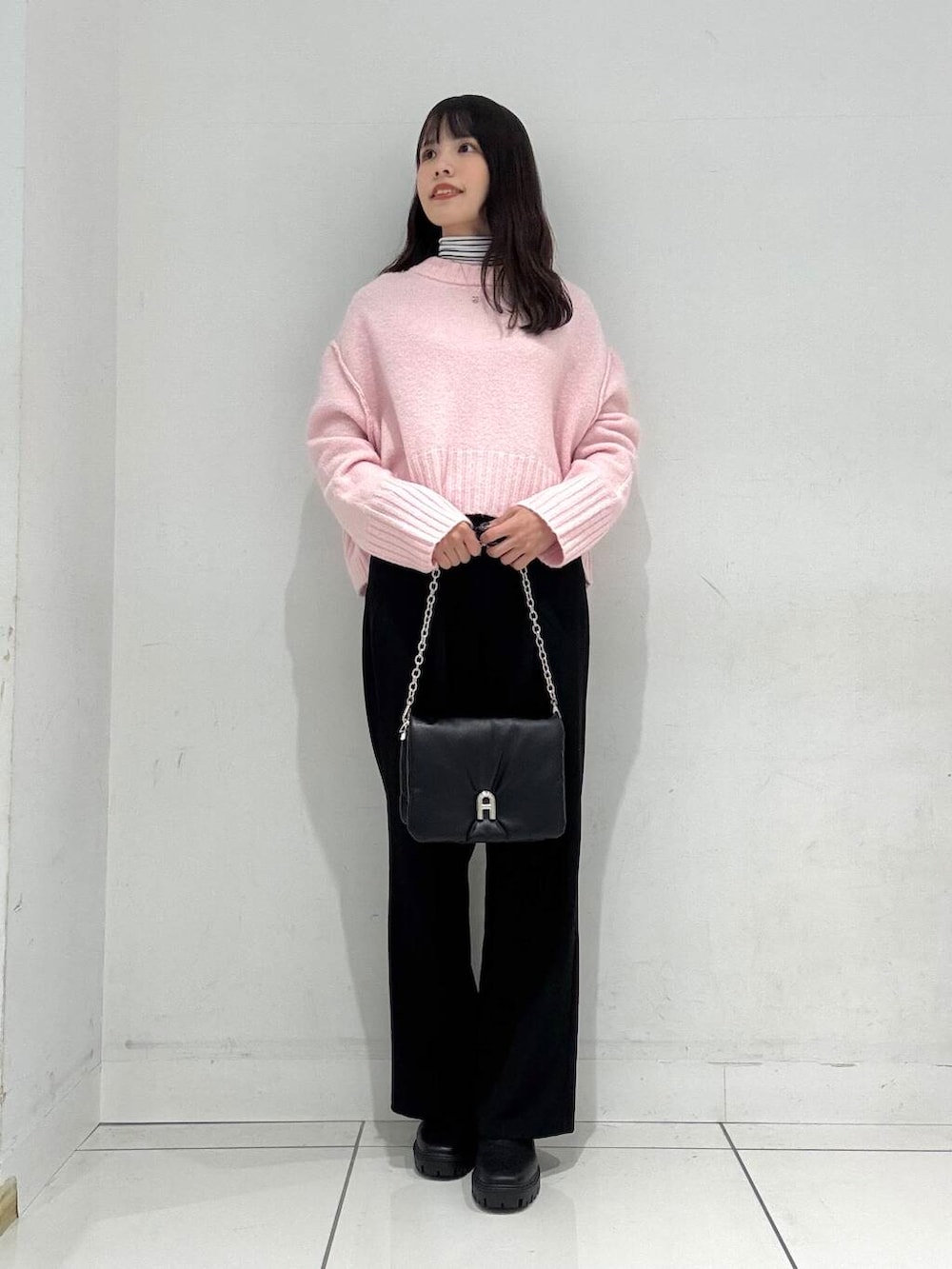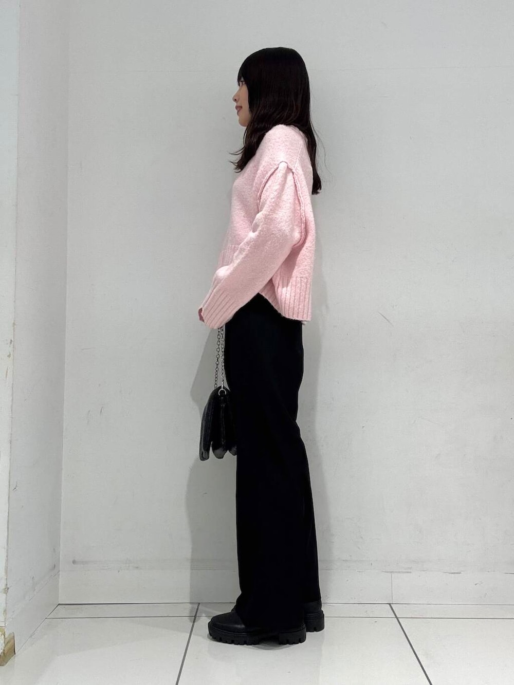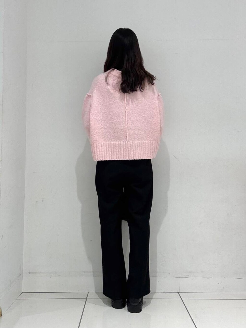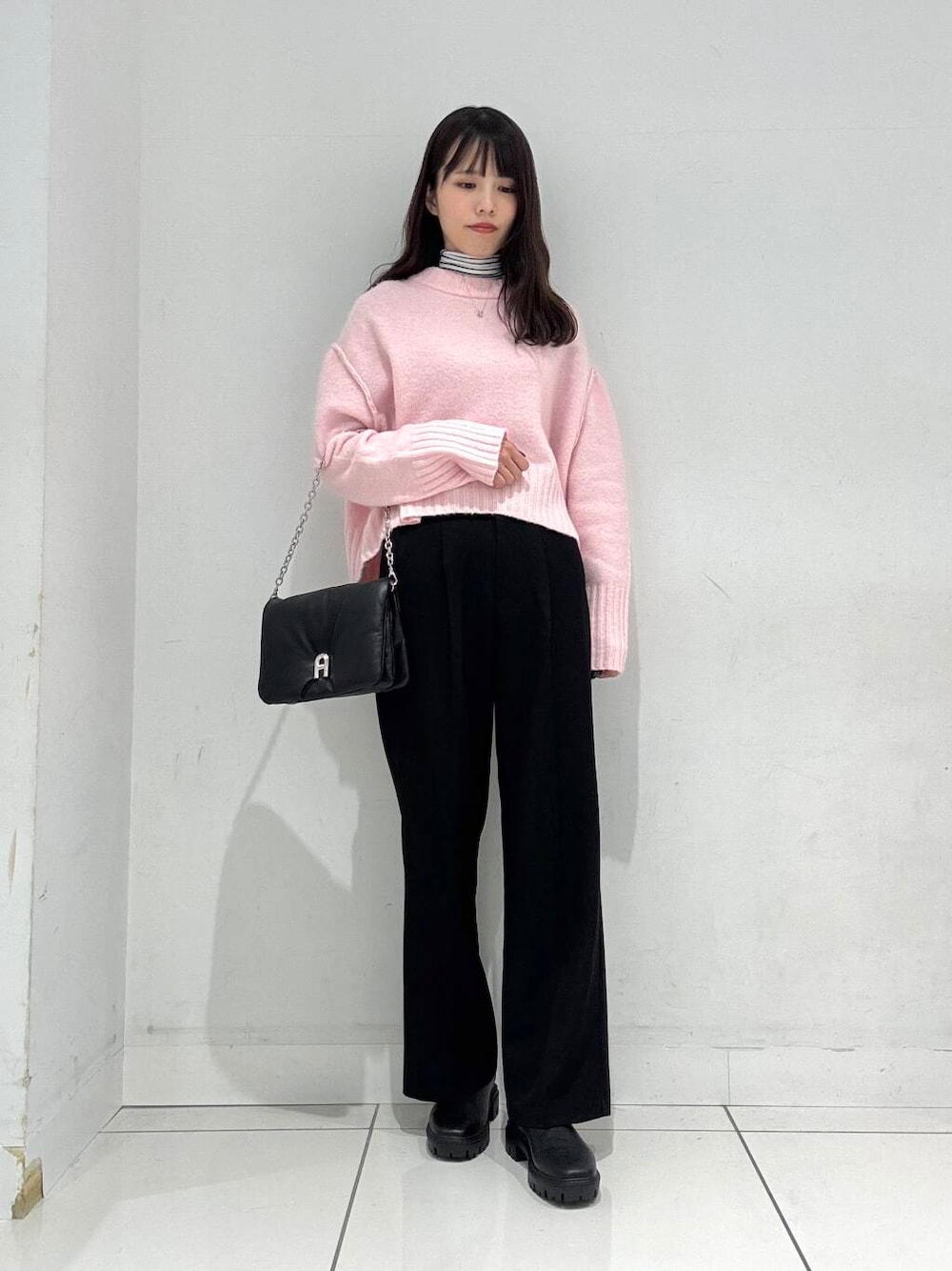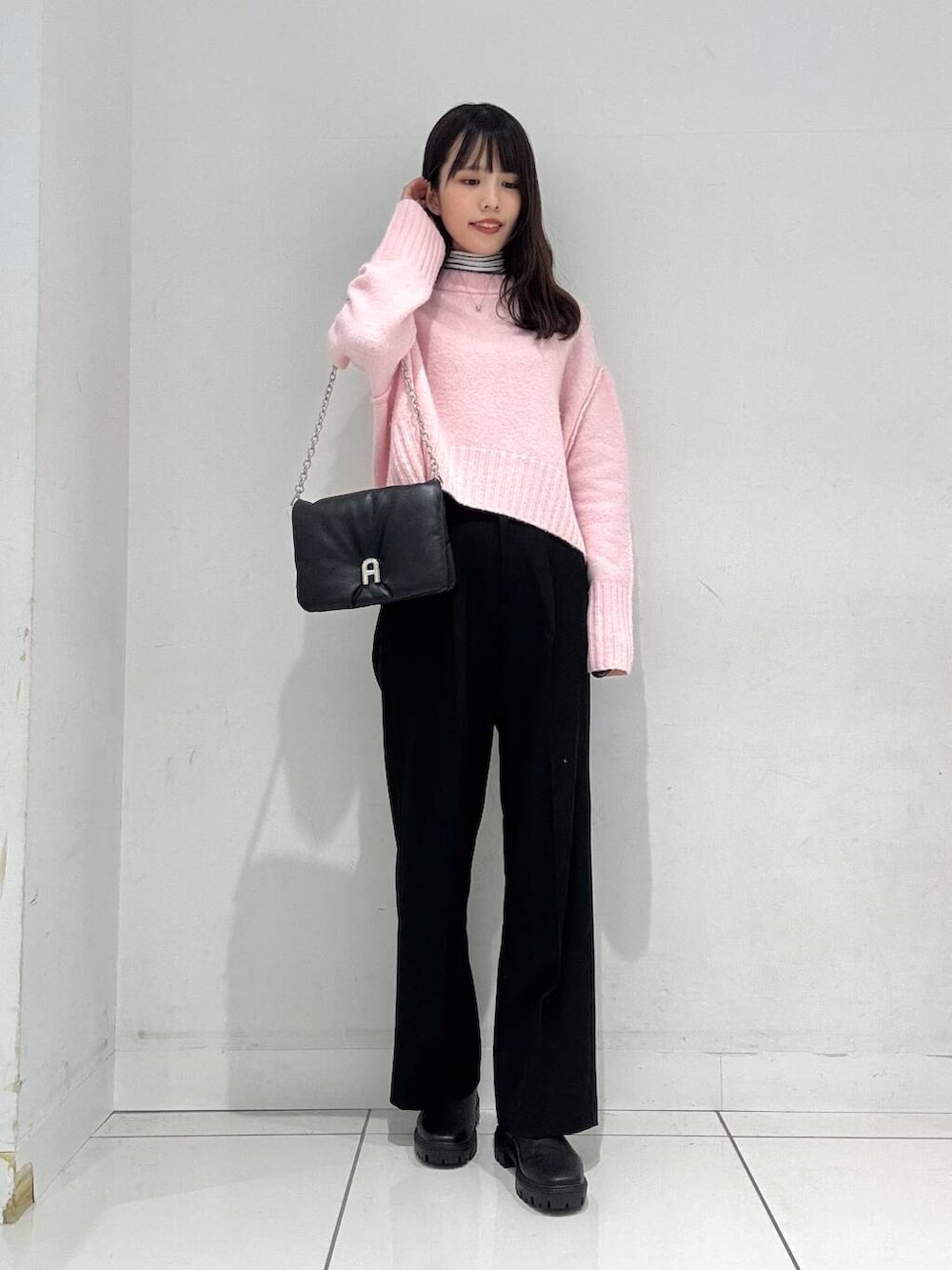 こちらのセーターは首周りがスッキリしているので、ハイネックと合わせやすいのがポイントです◎