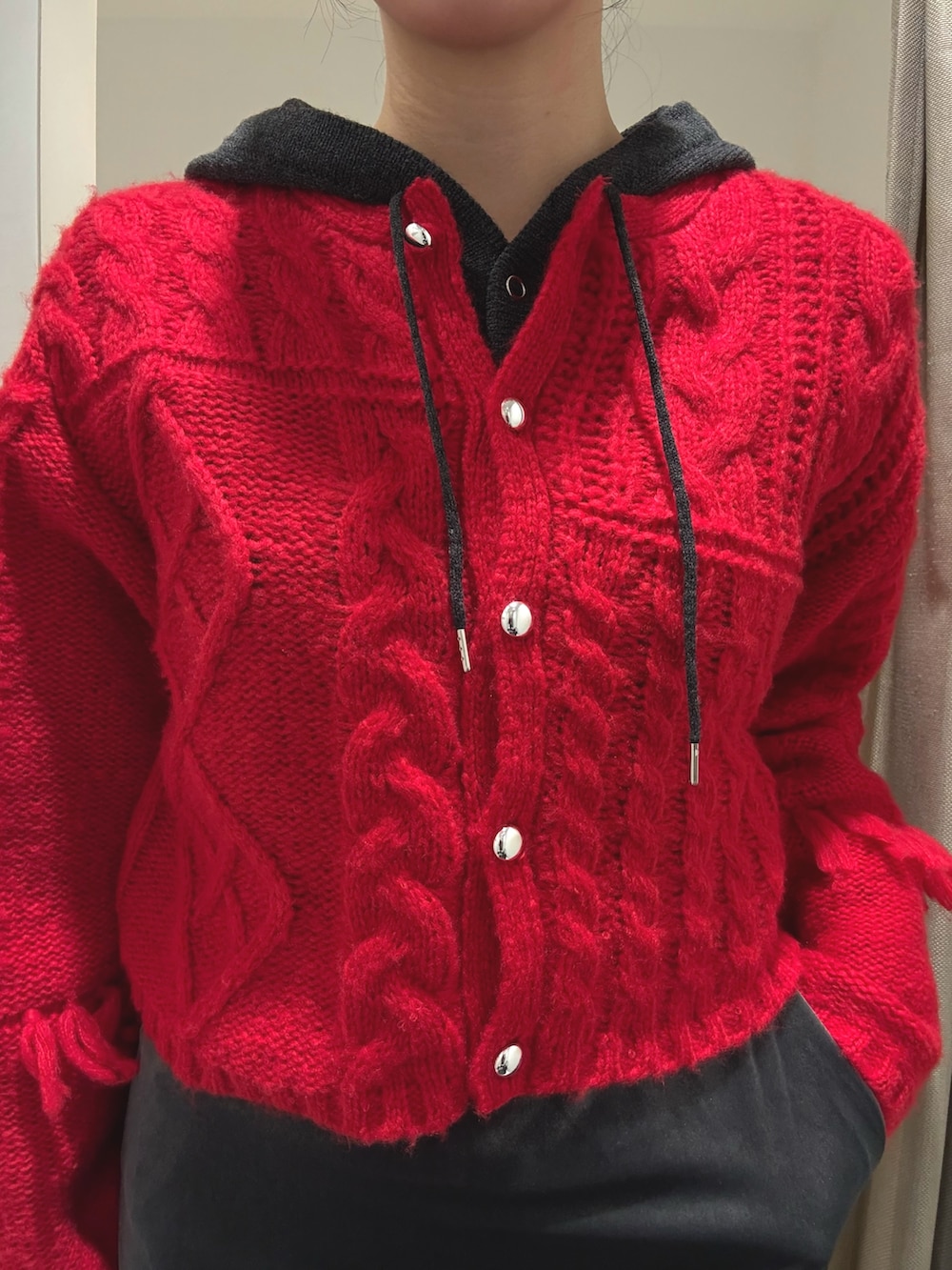 ニットのフーディーと赤のボレロを使った大人カジュアルコーデです♥️