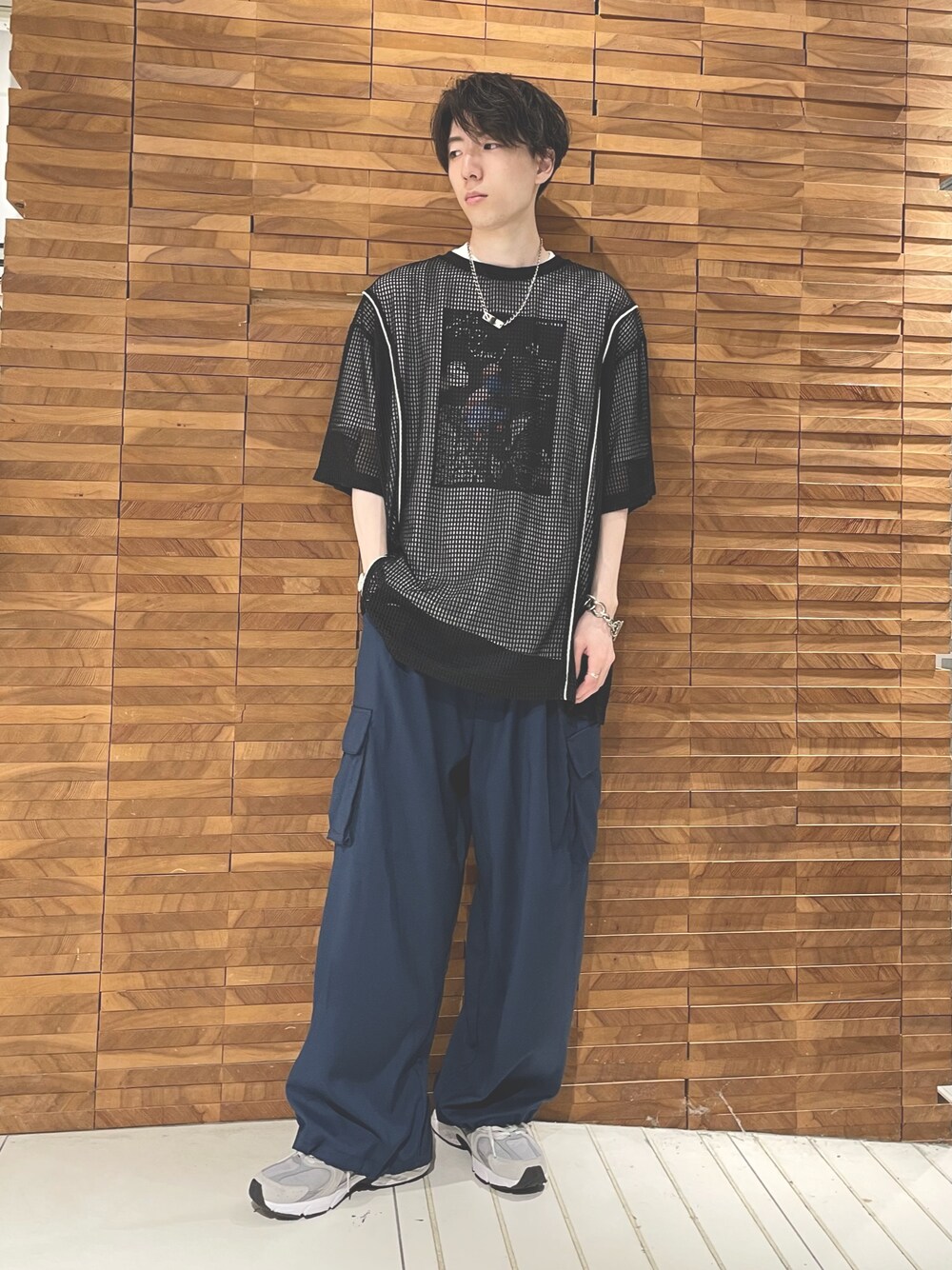 フォトグラフィックT×メッシュTのレイヤードコーデになります。