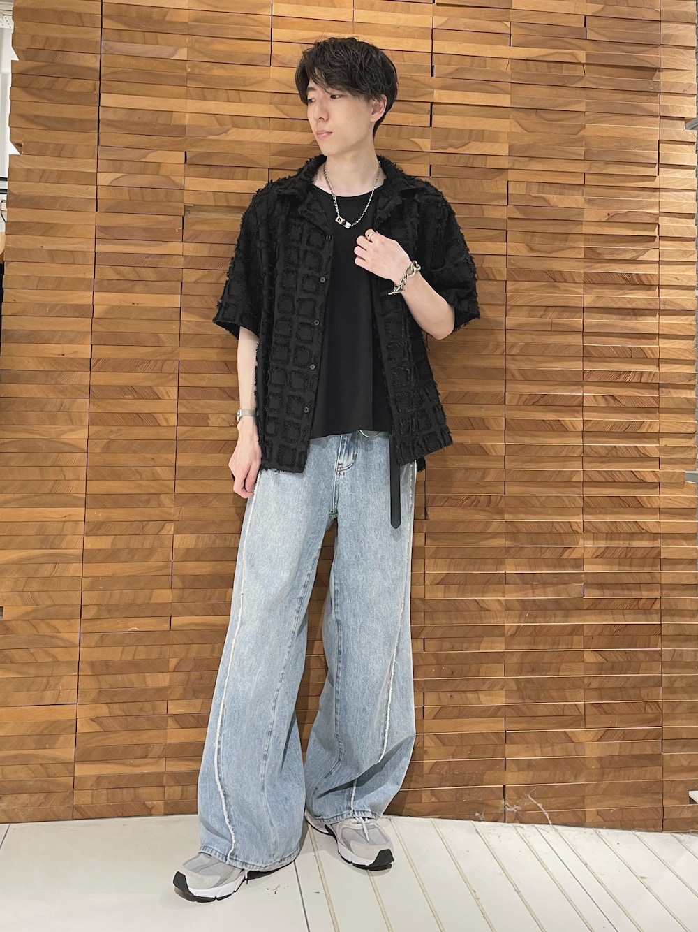 フリンジシャツにデニムを合わせコーディネートです。